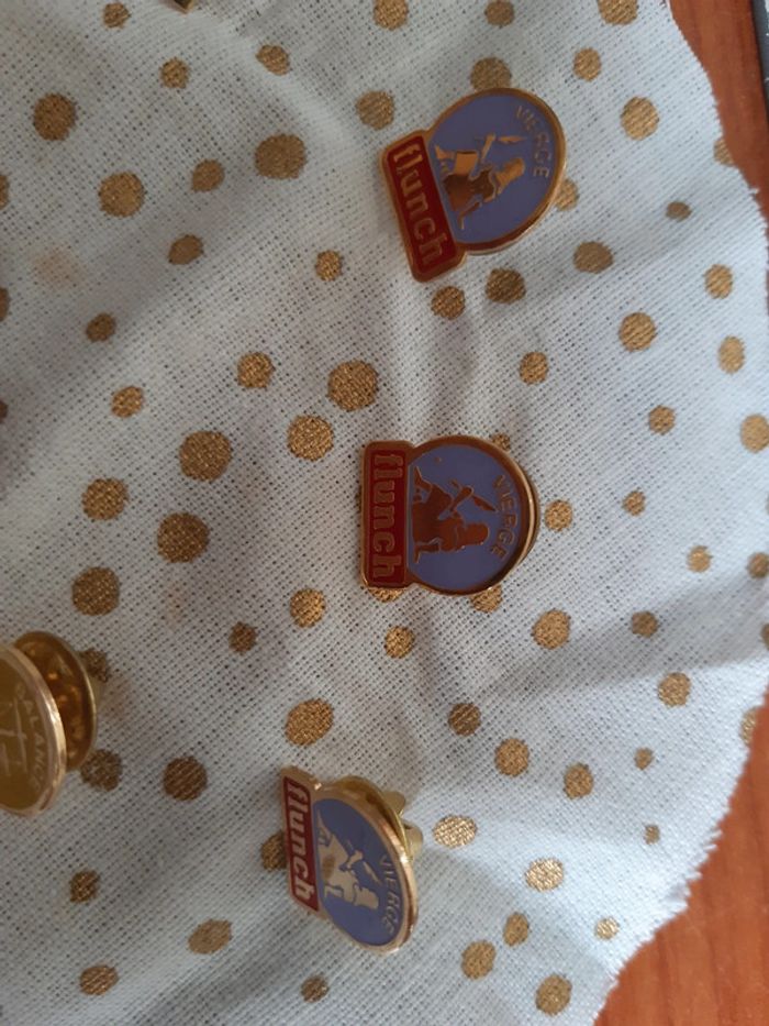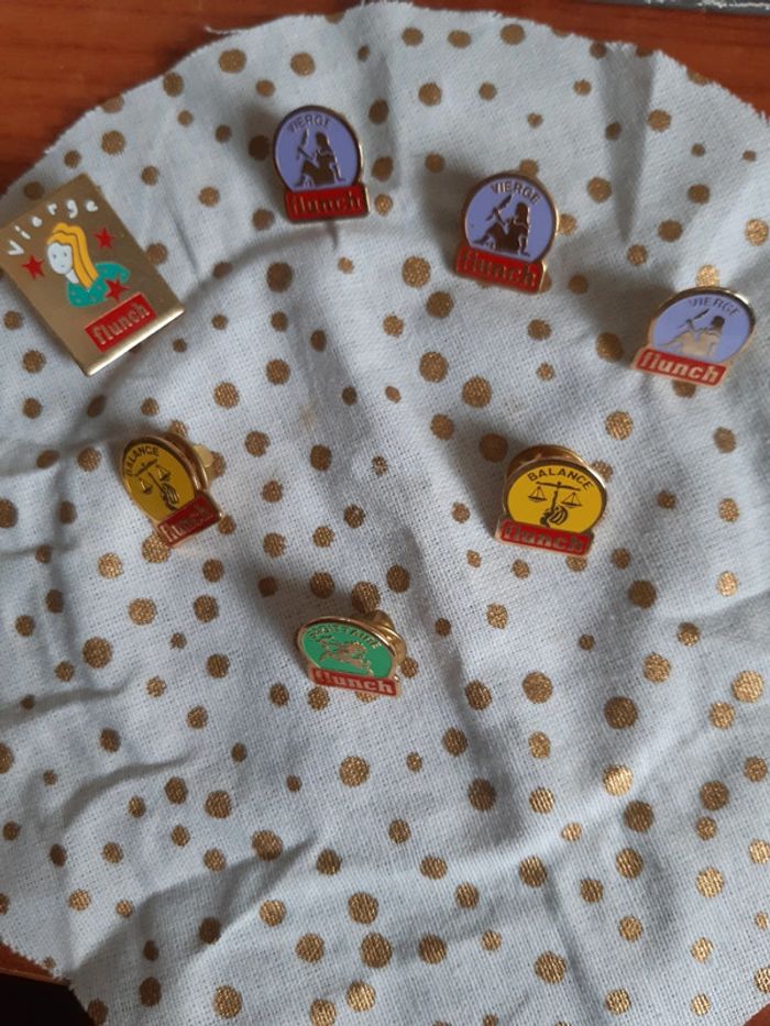7 pin's Horoscope Flunch 3 vierges 2,5€ piece 1 vierges 3 € 2 balance 2,5€ pièce 1 sanitaire 2,5€ Ou Les 7 pour 15 €