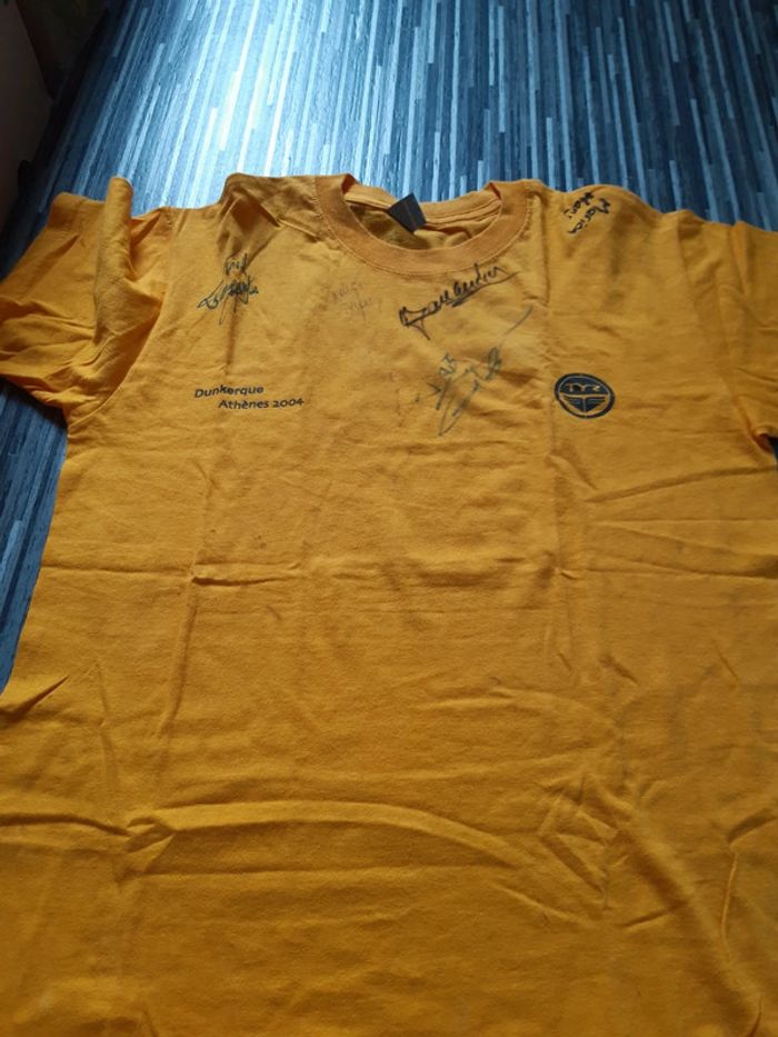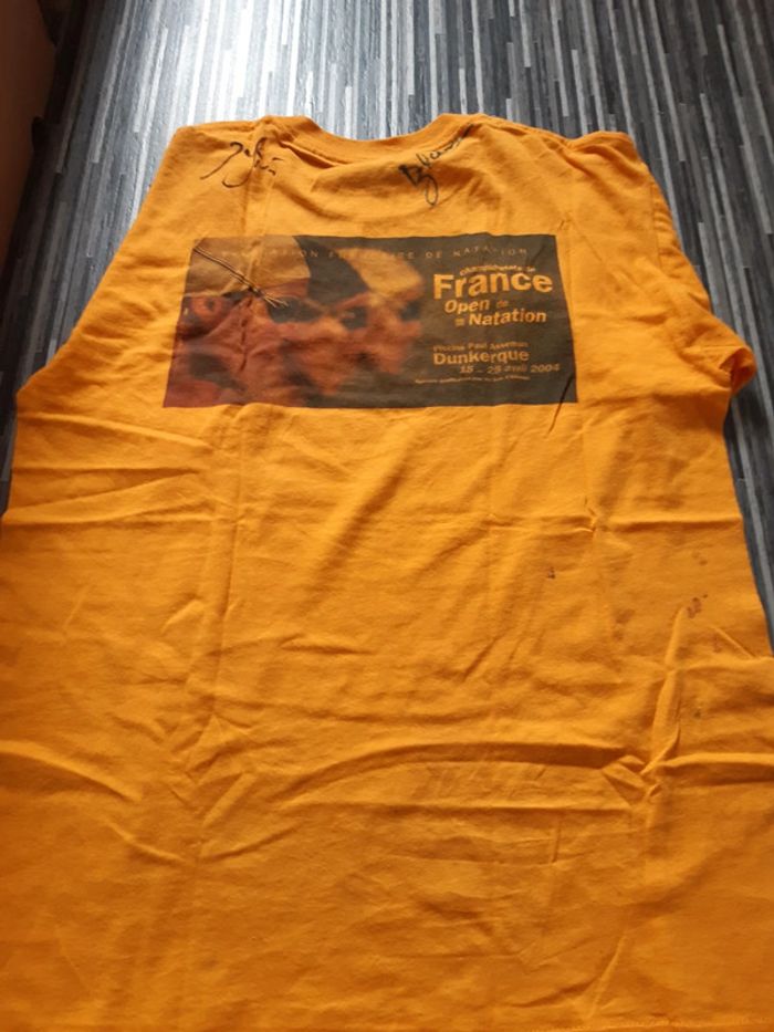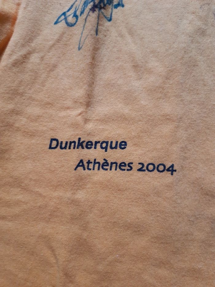 Tee-shirt Collector Championnat de France Dunkerque 18 au 25 Avril 2004 Épreuves qualificatives pour les jeux d'Athènes Signe par des nageurs N'a jamais été lavé Quelques tâches Signature de Marion Hans Simon Dufour Fred Bousquet Et d'autres dont je ne relie pas les signatures