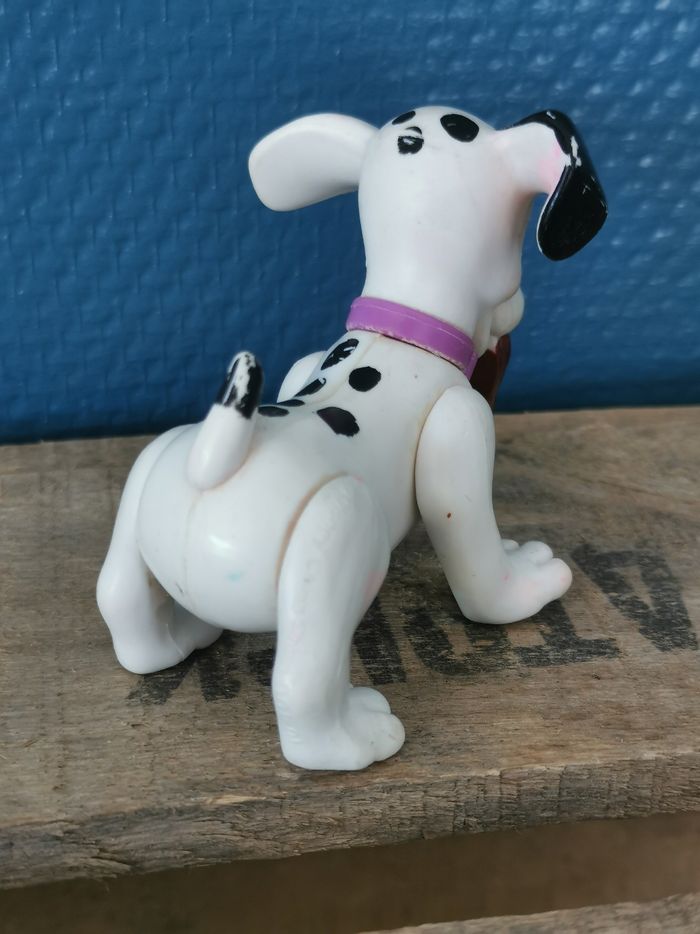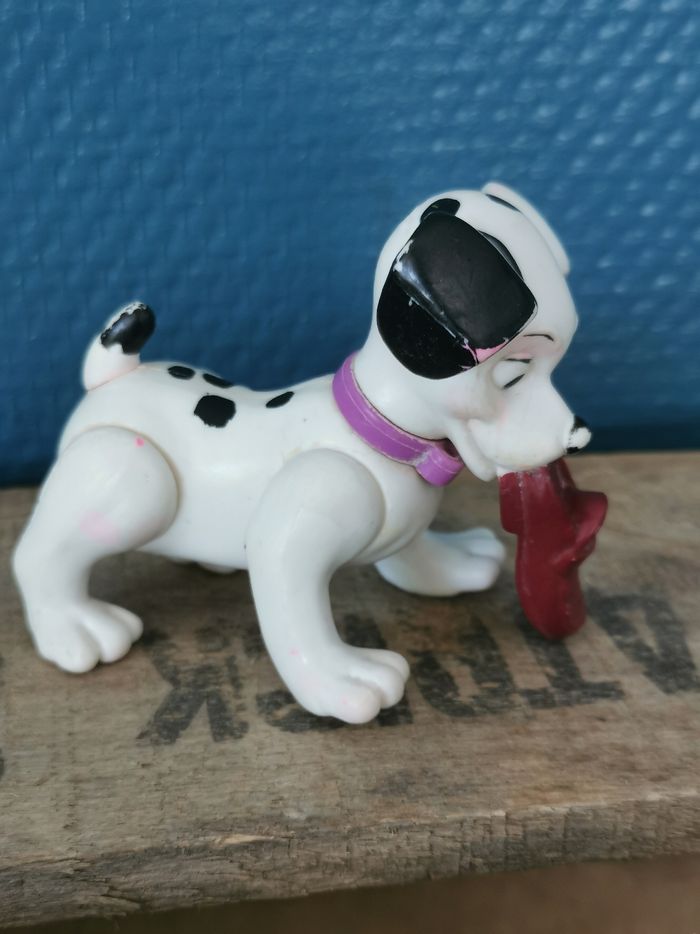 Figurine Dalmatien tenant une chaussure dans sa gueule, collier violet, du dessin animé Disney les 101 Dalmatiens. De nombreux manques de couleurs, jaunis par endroit, des tâches roses sur le blanc. Etat satisfaisant