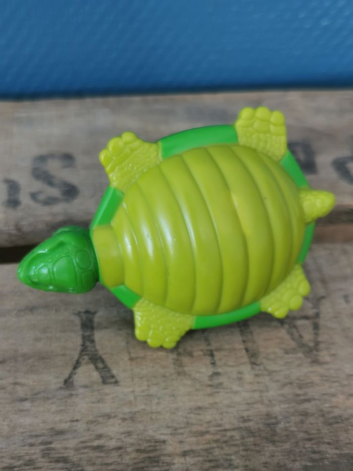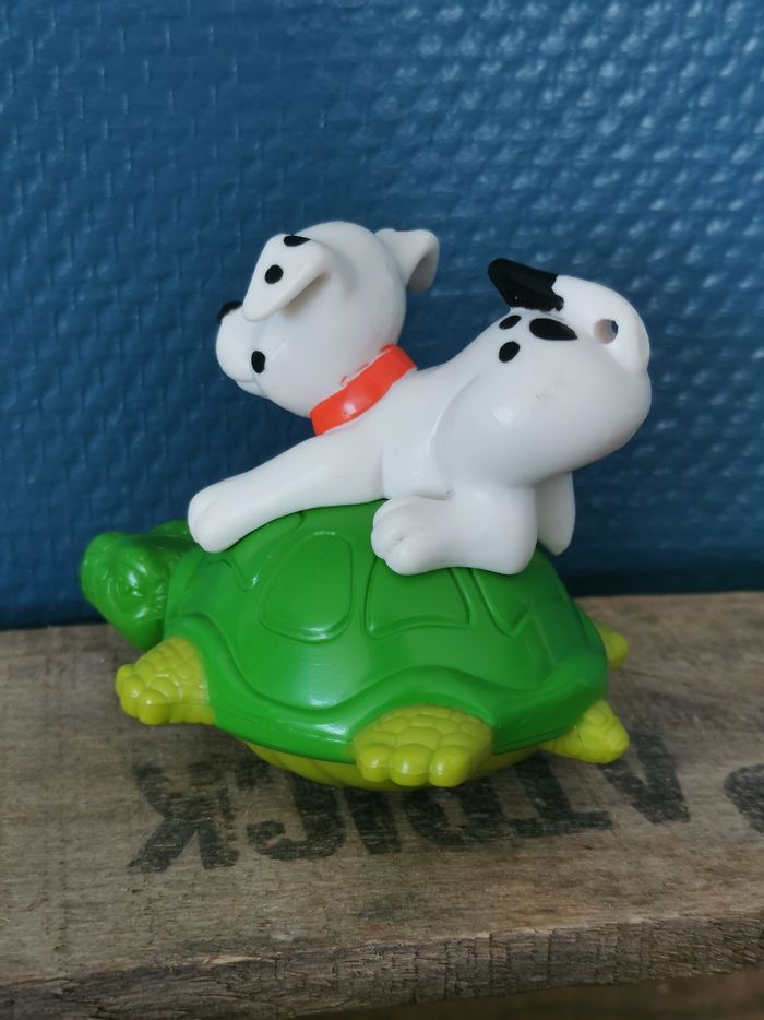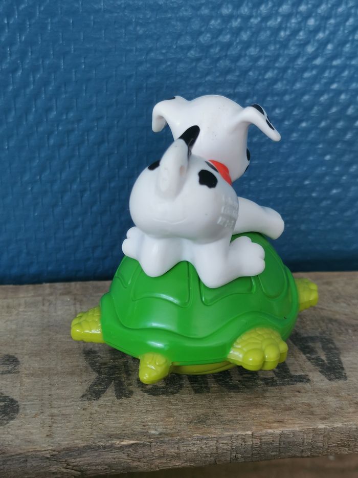 Figurine Dalmatien sur une tortue verte, collier orange ou rouge, du dessin animé Disney les 101 Dalmatiens. La tortue fait office de culbuto. A noter des légers manques de couleurs. En bon état général.