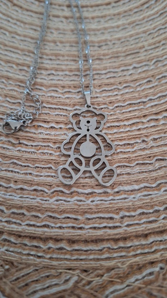 Collier en acier inoxydable avec un pendentif en forme de nounours. Neuf jamais porté.