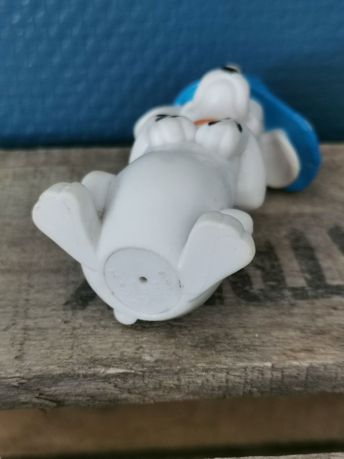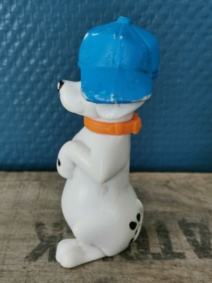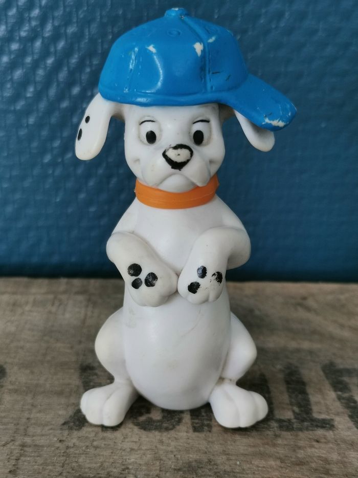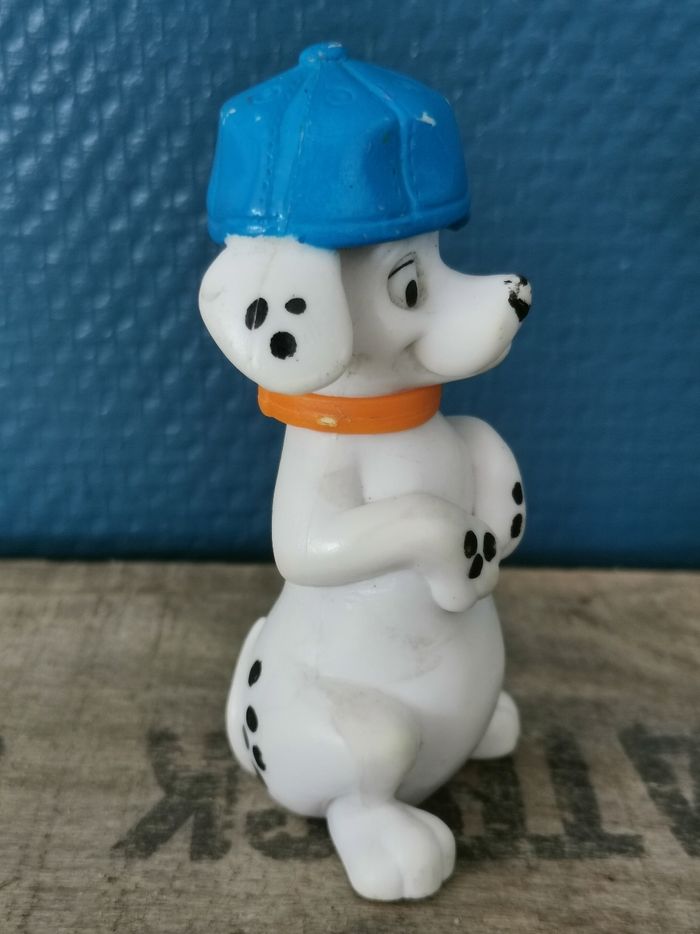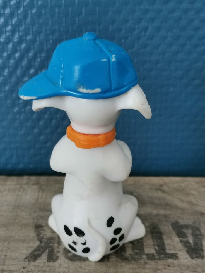 Figurine Dalmatien casquette bleue avec collier orange., du dessin animé Disney les 101 Dalmatiens. A noter des grands manques de couleurs sur le bout du nez, également sur la casquette. Un peu jaunie par endroit. En bon état général.
