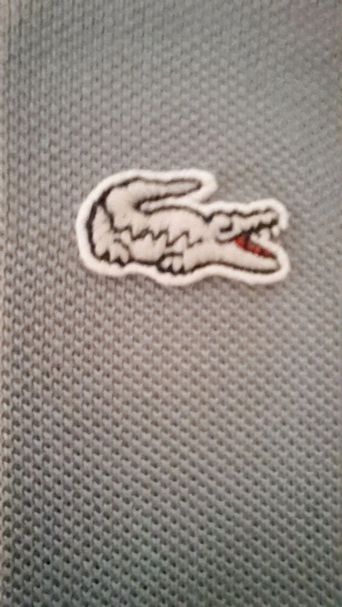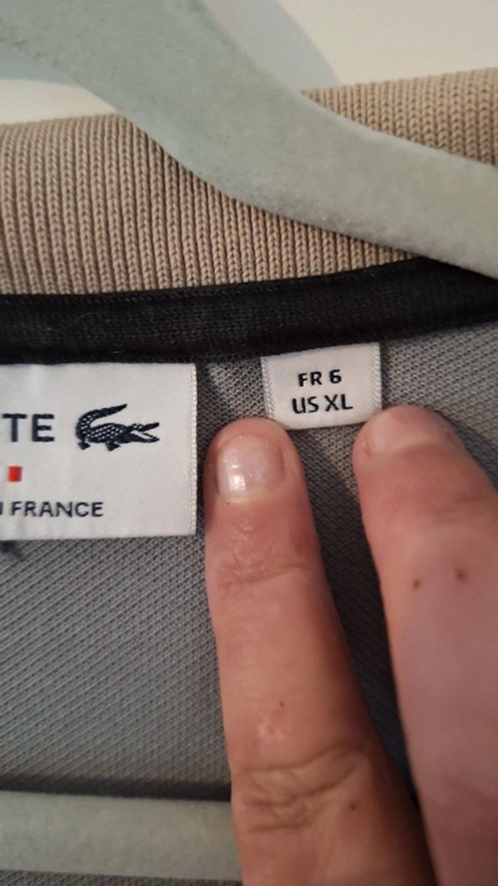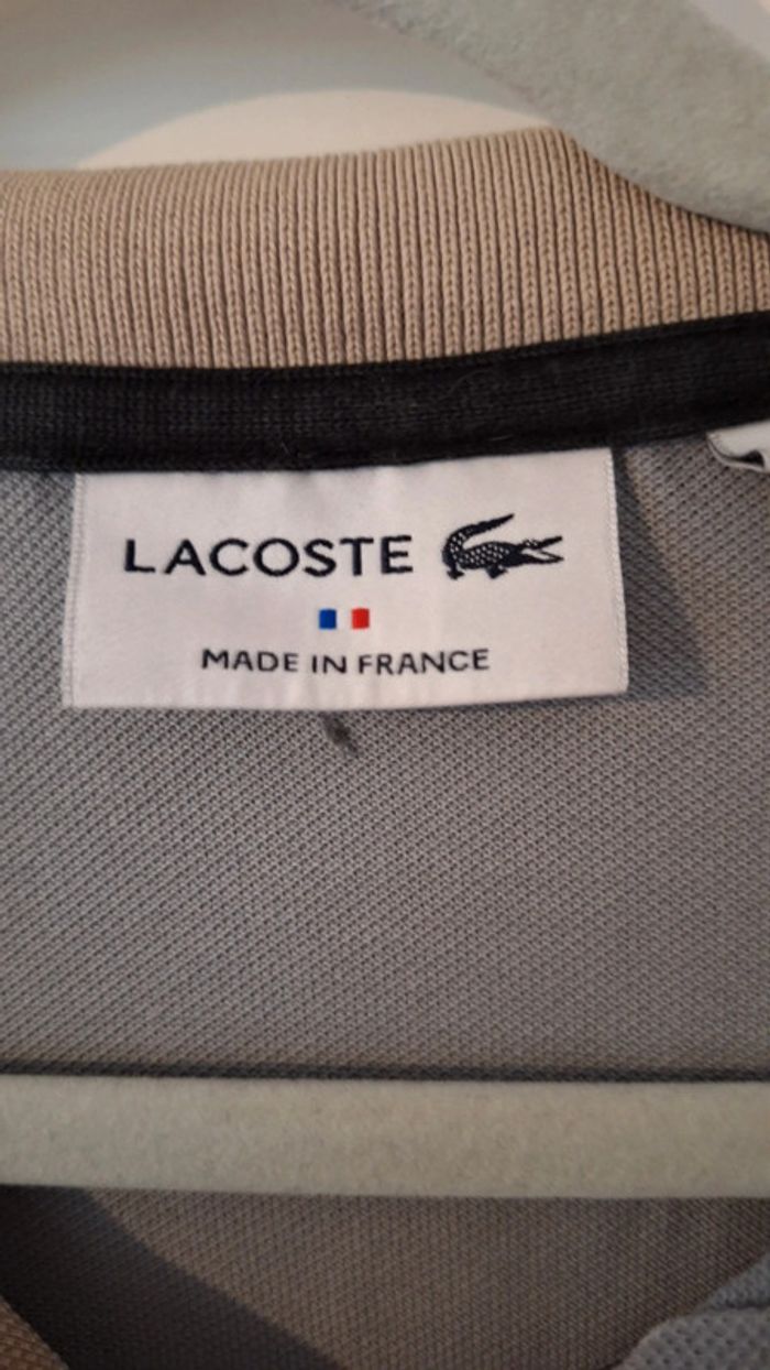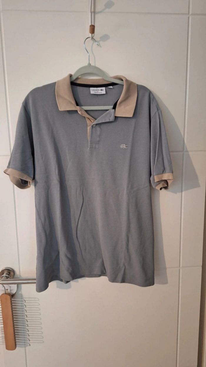 Polo Lacoste à manches courtes de couleur gris et beige. Manches courtes. Polo personnalisé sur le site internet Lacoste. Très bon état. Taille XL (= taille 6 de chez Lacoste) - Largeur d'aisselle à aisselle : 64 cm. - Longueur : 73 cm.
