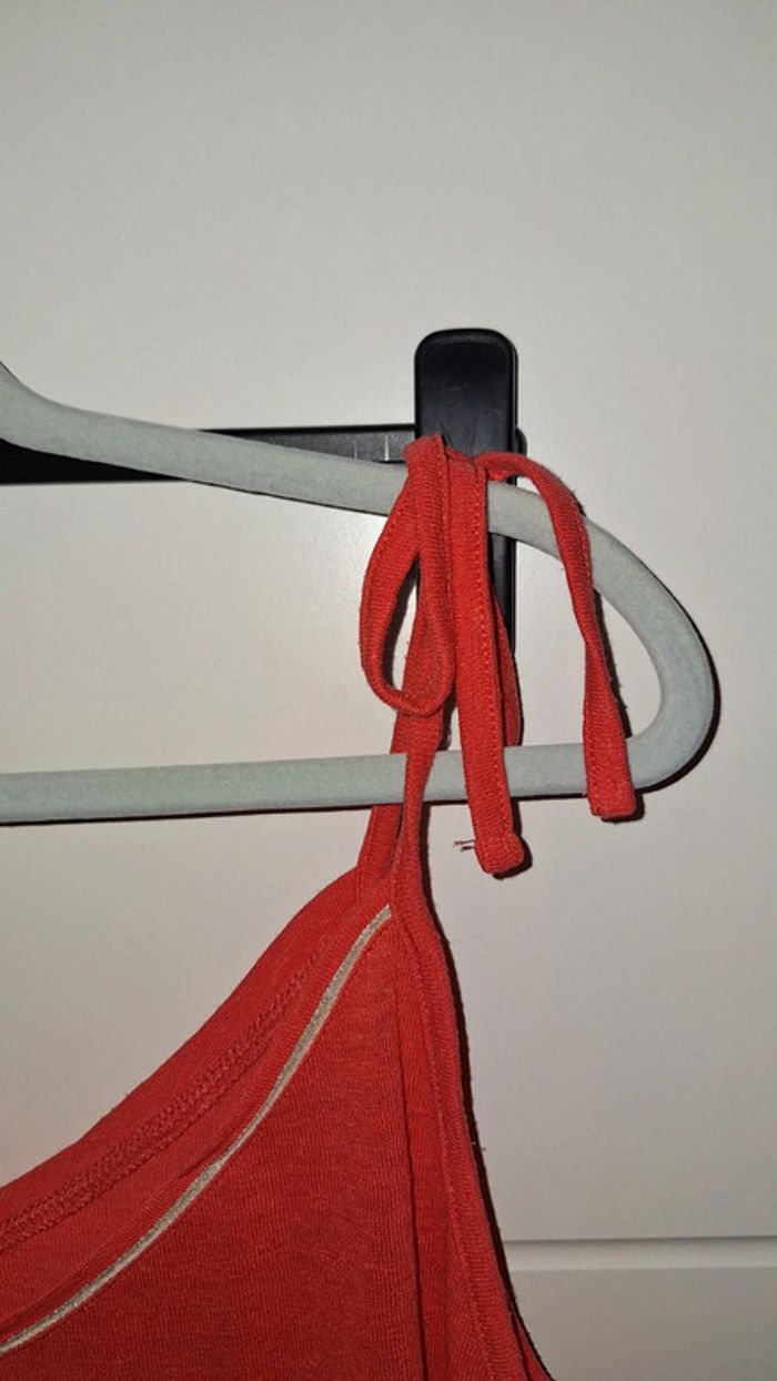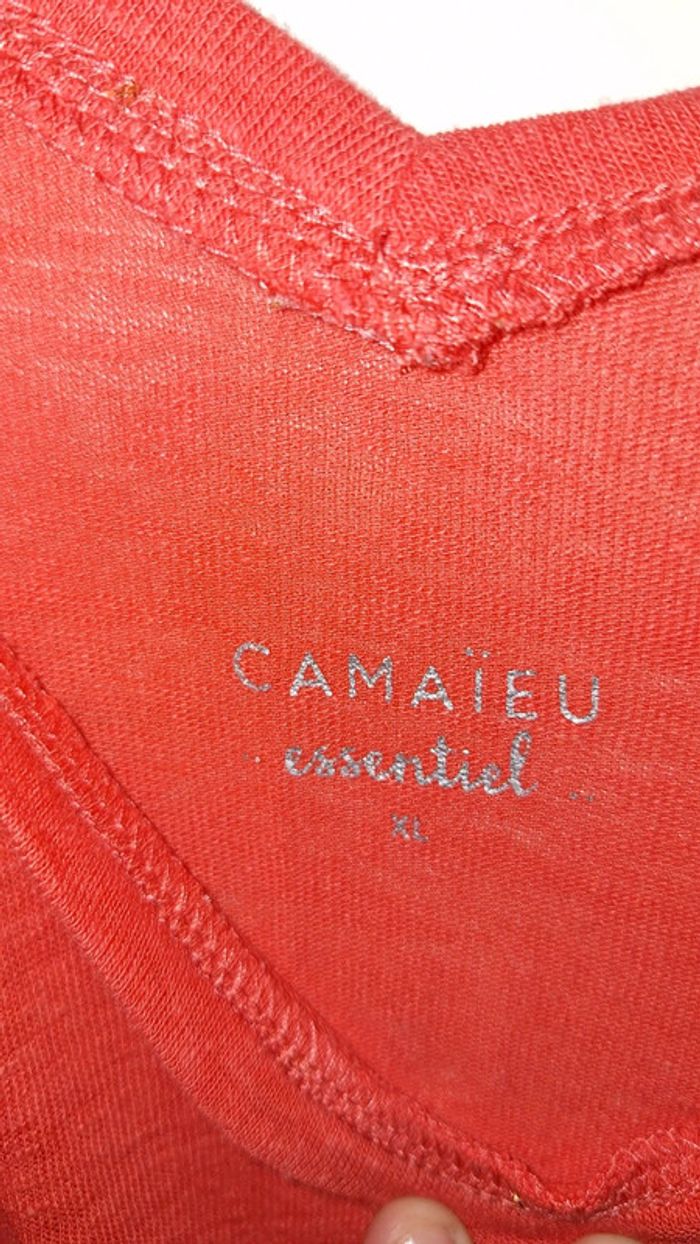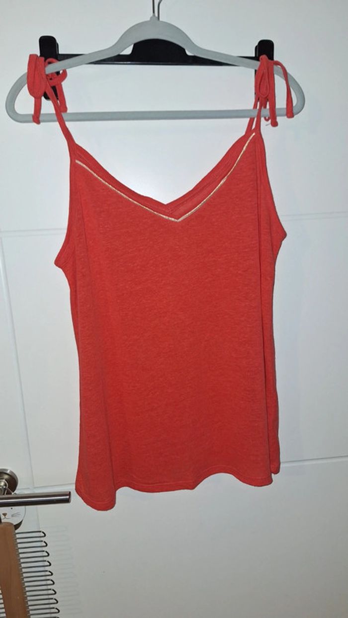 Débardeur en lin couleur corail de chez Camaïeu. Bretelles réglables qui se nouent. Un peu transparent. Comme neuf. Taille XL. - Largeur d'aisselle à aisselle : 54 cm.