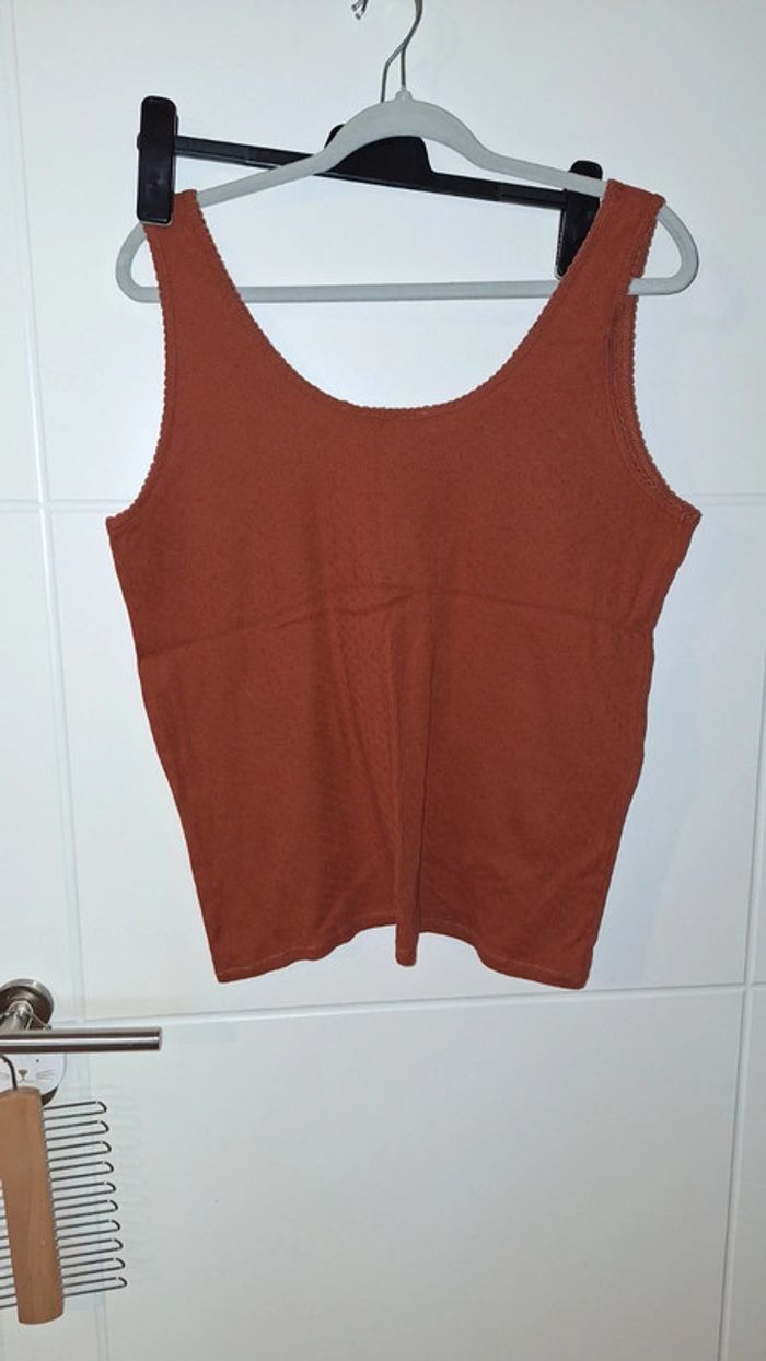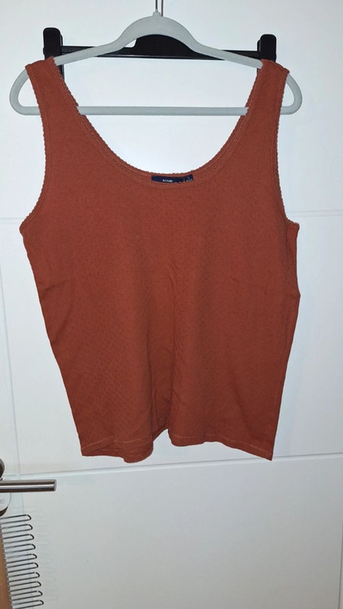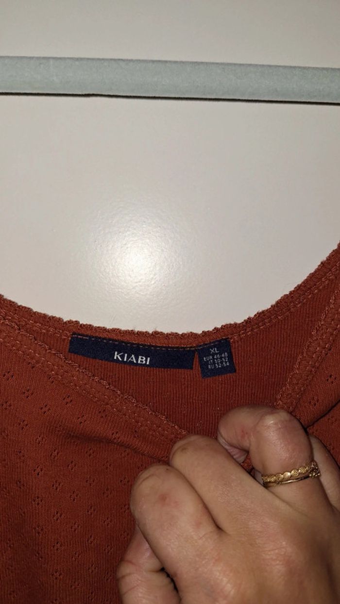 Haut de pyjama en coton couleur rouille de chez Kiabi. Très bon état. Taille 46/48 mais taille petit. - Largeur d'aisselle à aisselle : 54 cm. - Longueur totale : 64 cm.