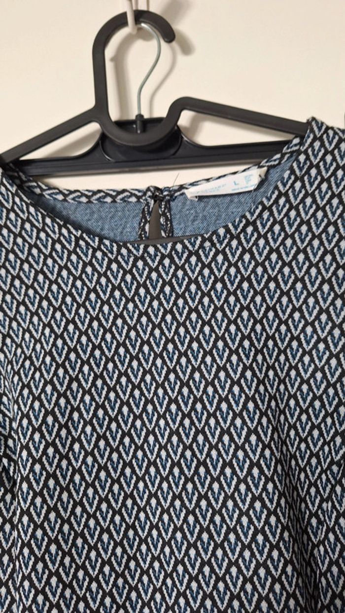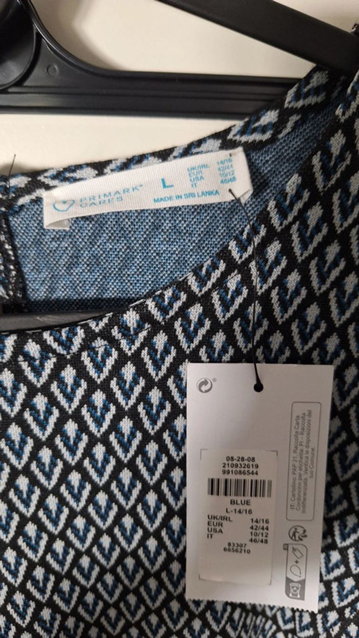 Robe coupe trapèze à motifs dans les tons bleu et blanc. Cintrée au niveau de la taille. Neuve avec étiquette 🏷. Taille 42-44 (L de chez Primark). - Largeur d'aisselle à aisselle : 49 cm. - Largeur taille : 48 cm. - Longueur : 92 cm.