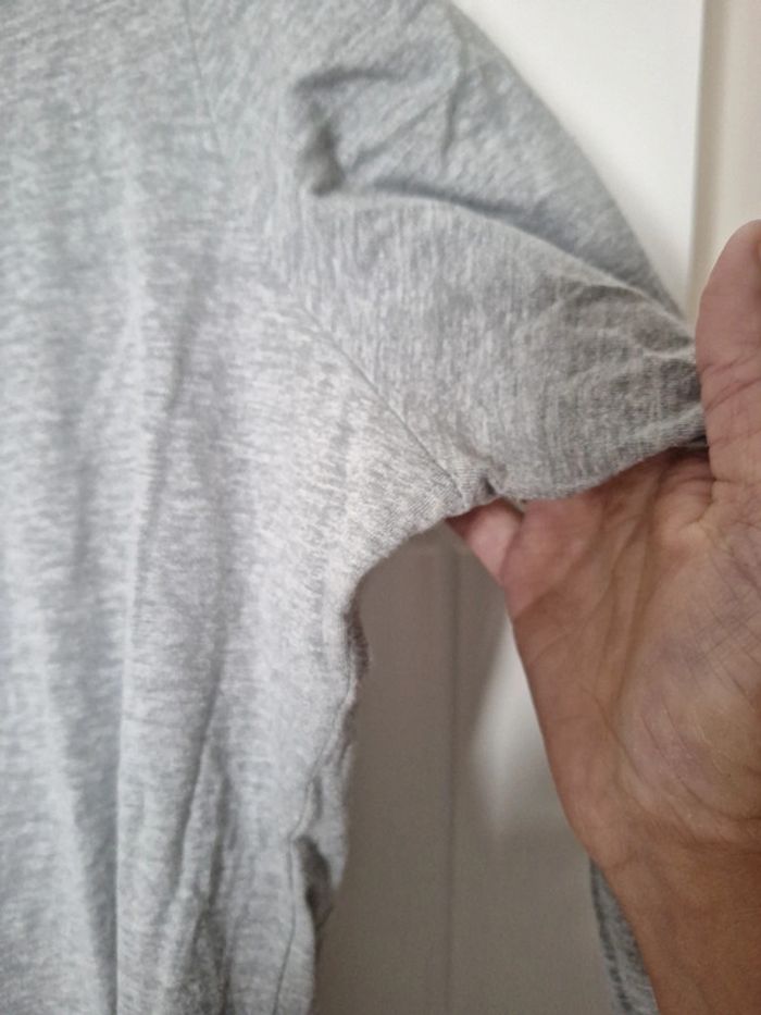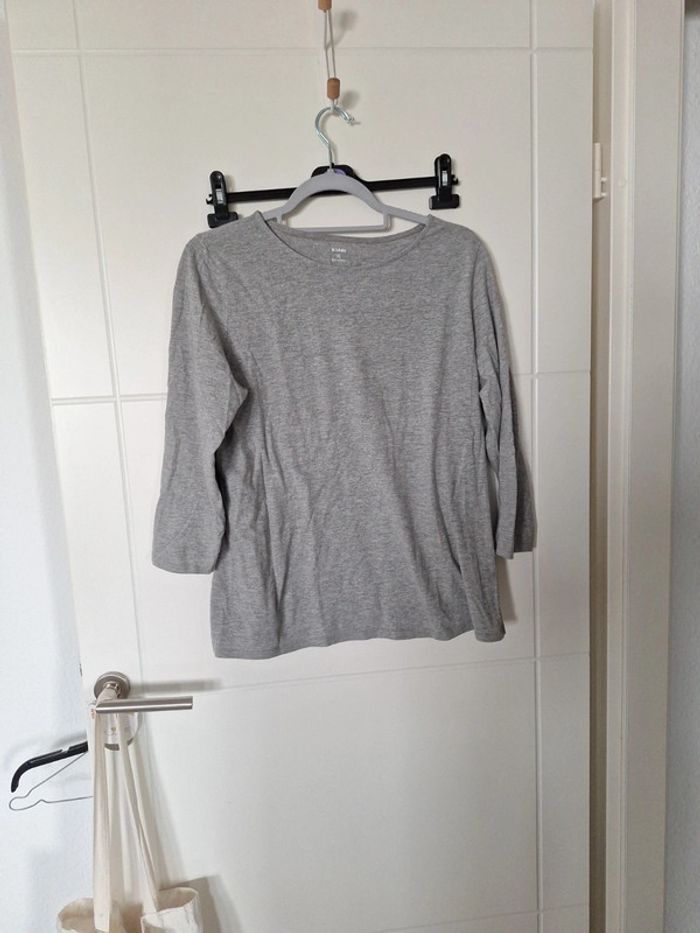 Tee shirt gris de chez Kiabi. Manches 3/4. Très bon état. Taille indiquée XL 46/48 mais taille très petit (voir les mesures) - Largeur d'aisselle à aisselle : 53 cm. - Longueur : 63 cm.