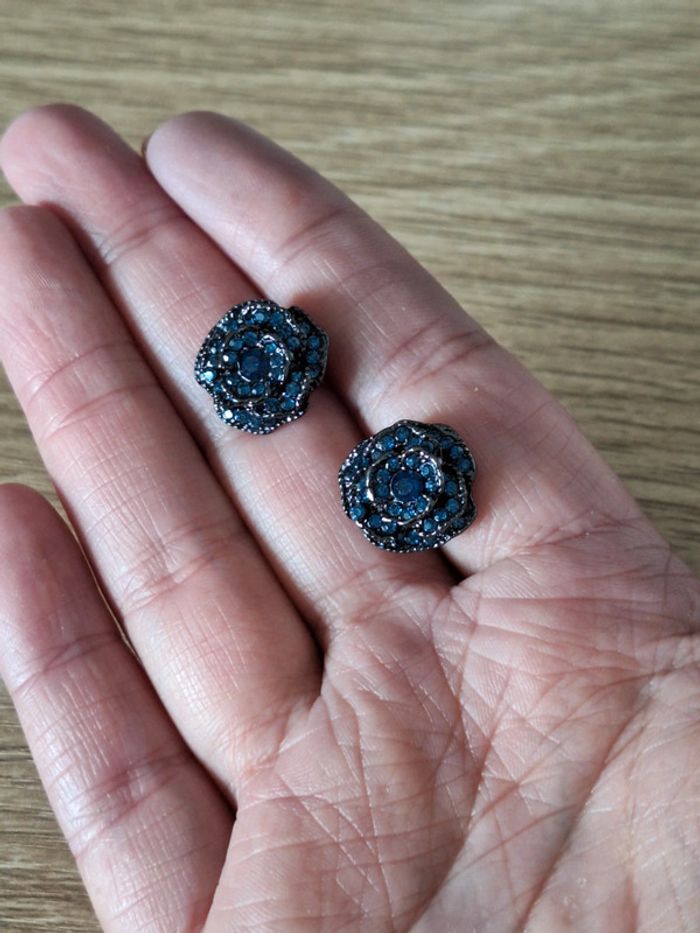 Puces d'oreilles en forme de fleurs bleu marine pailleté. Neuves jamais portées.