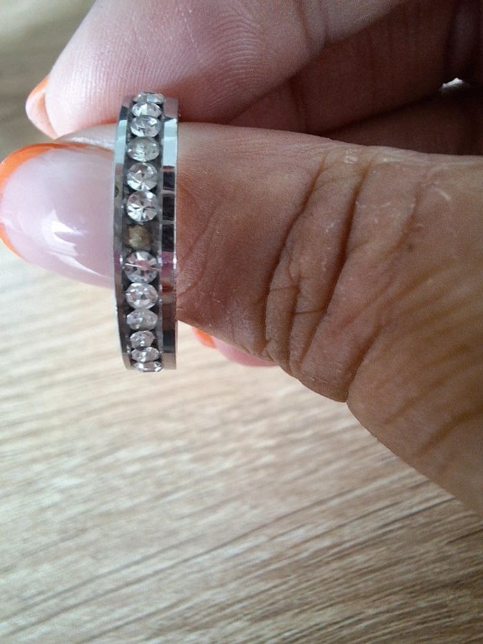Bague en acier inoxydable avec zirconiums. Un zircon est partie à l'arrière de la bague. Seul défaut présent. Taille 56-57.