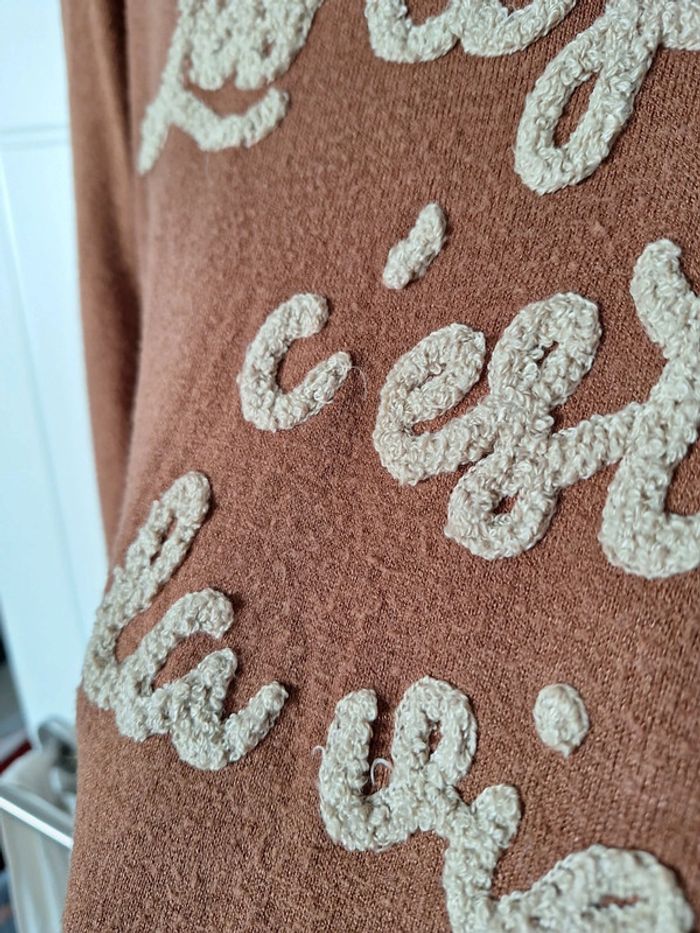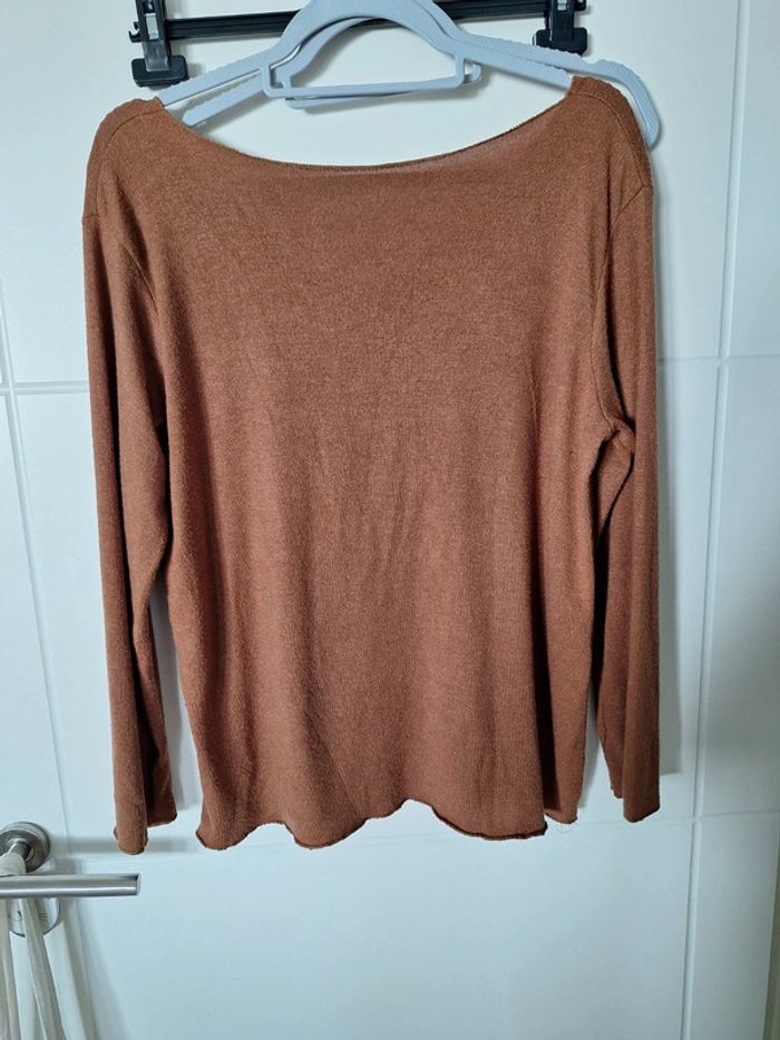 Pull de couleur camel. Matière douce. Petites bouloches sur l'ensemble. Bon état. Taille unique. - Largeur d'aisselle à aisselle : 55 cm - Longueur : 65 cm