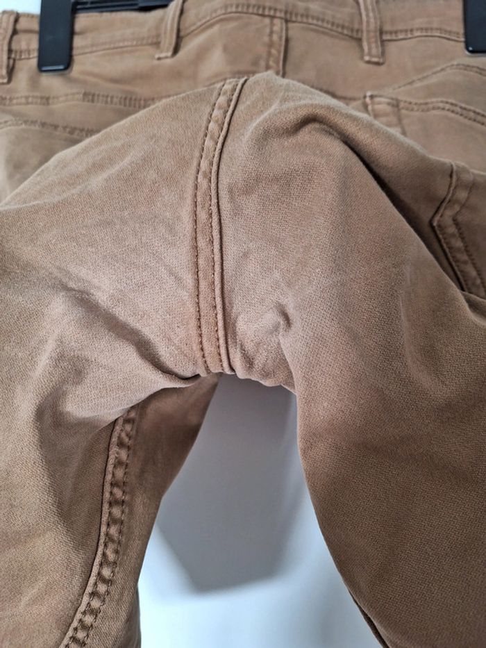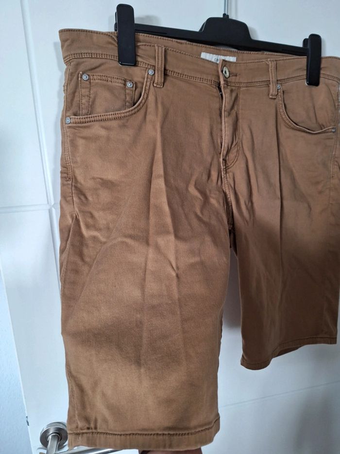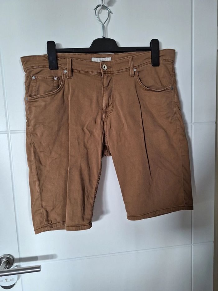Short en coton de couleur camel. Matière extensible. Porté plusieurs fois il présente une usure au niveau de l'entrejambe. Taille 46.