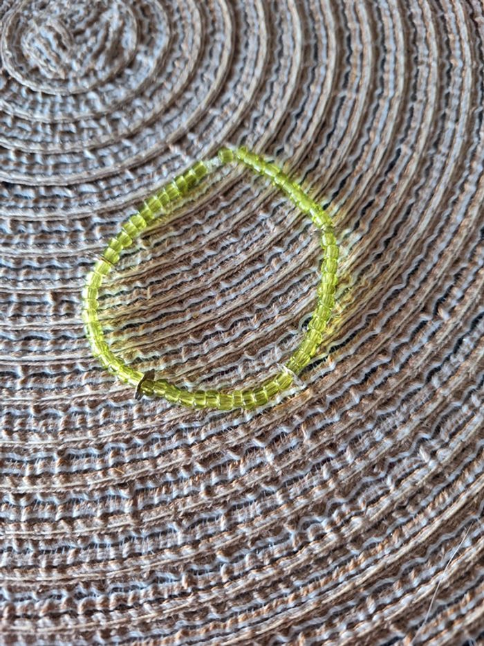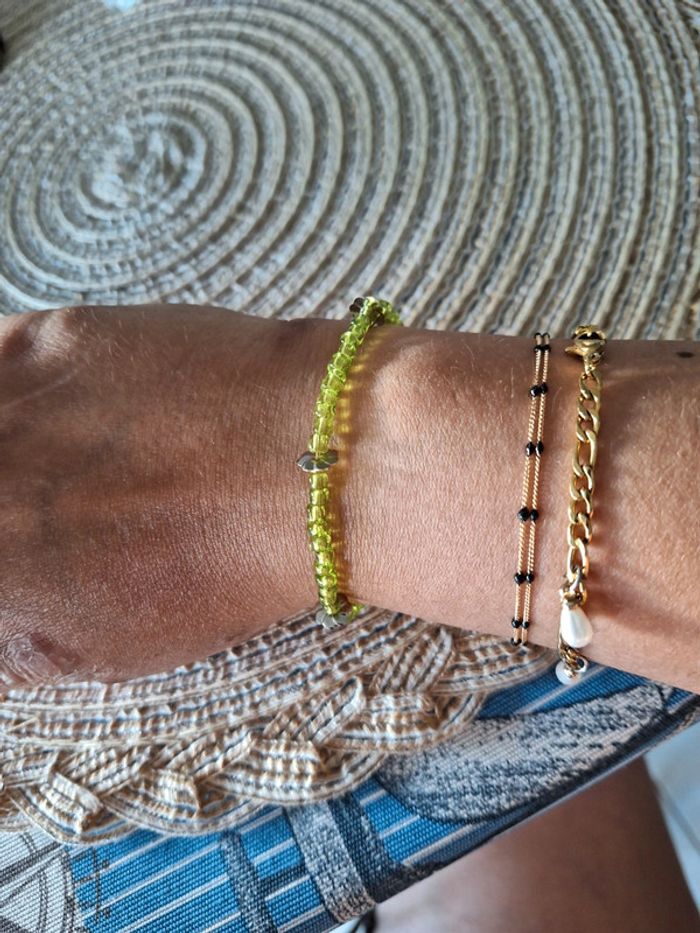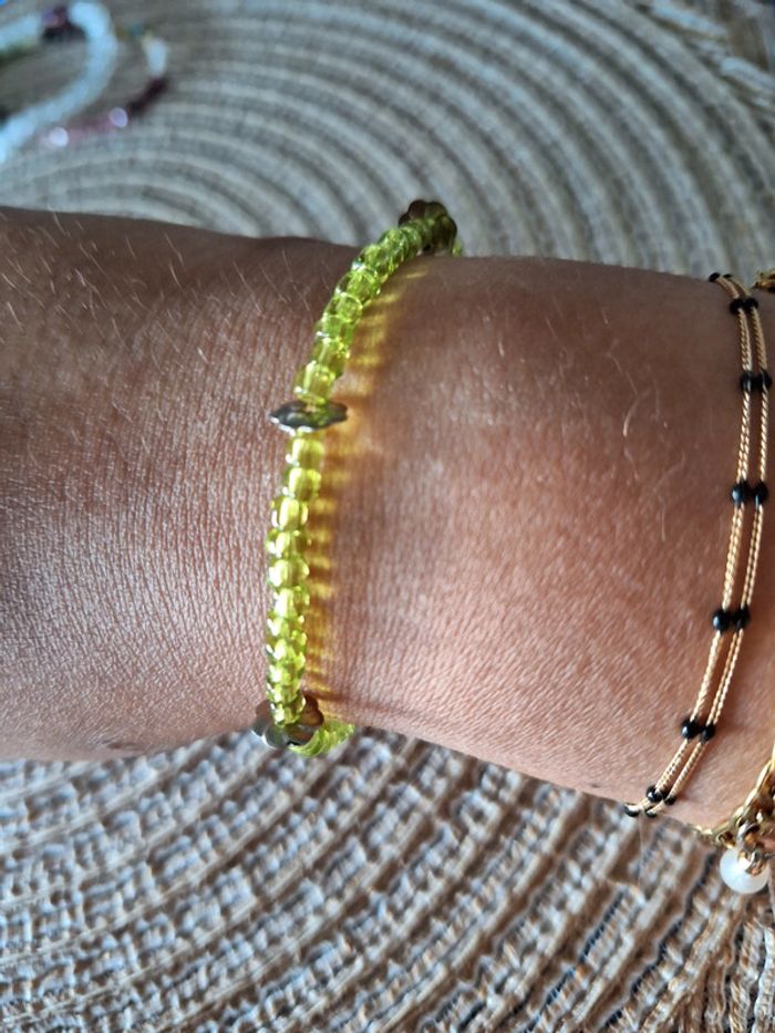 Bracelet en perles de couleur vert pomme avec 5 pampilles argentées. Bracelet extensible. Très bon état.