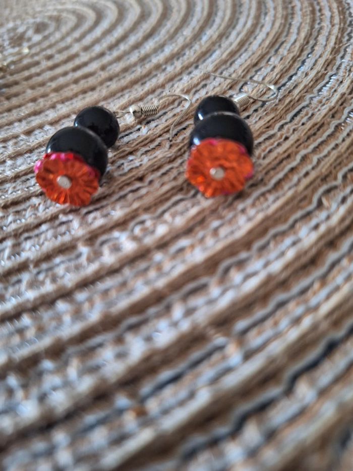 BO fantaisie avec perles noires et fleurs plates couleur orangé. Très bon état.