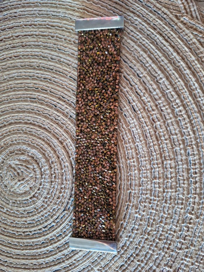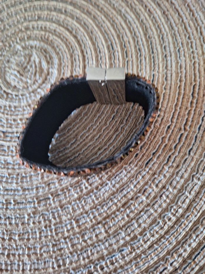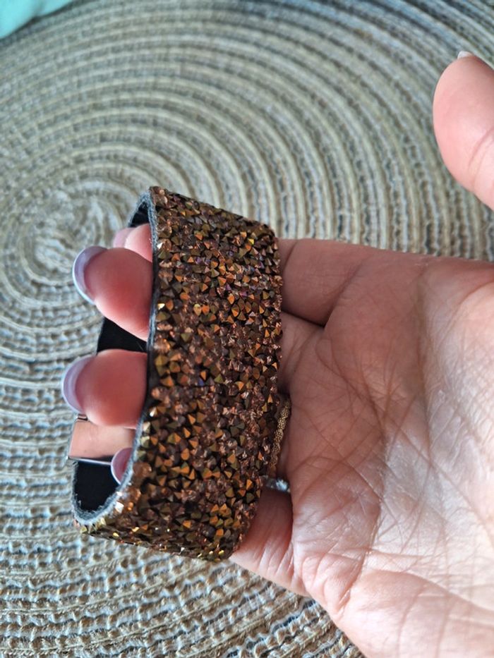 Bracelet manchette de couleur marron avec des strass. L'intérieur de la manchette est en sorte de velours noir. Très bon état.