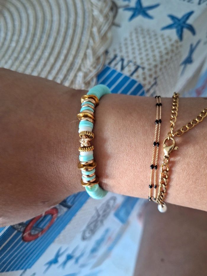 Bracelet bleu clair avec du blanc et du doré. En perles heishi. Bracelet élastique. Neuf.
