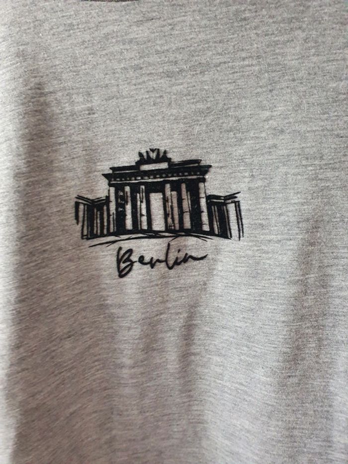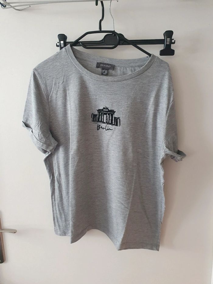 Tee shirt gris de chez Primark. A l'effigie de Berlin. Porté quelques fois mais la matière bouloche vite. Taille L soit 42-44. - Largeur d'aisselle à aisselle : 53 cm. - Longueur : 60 cm.