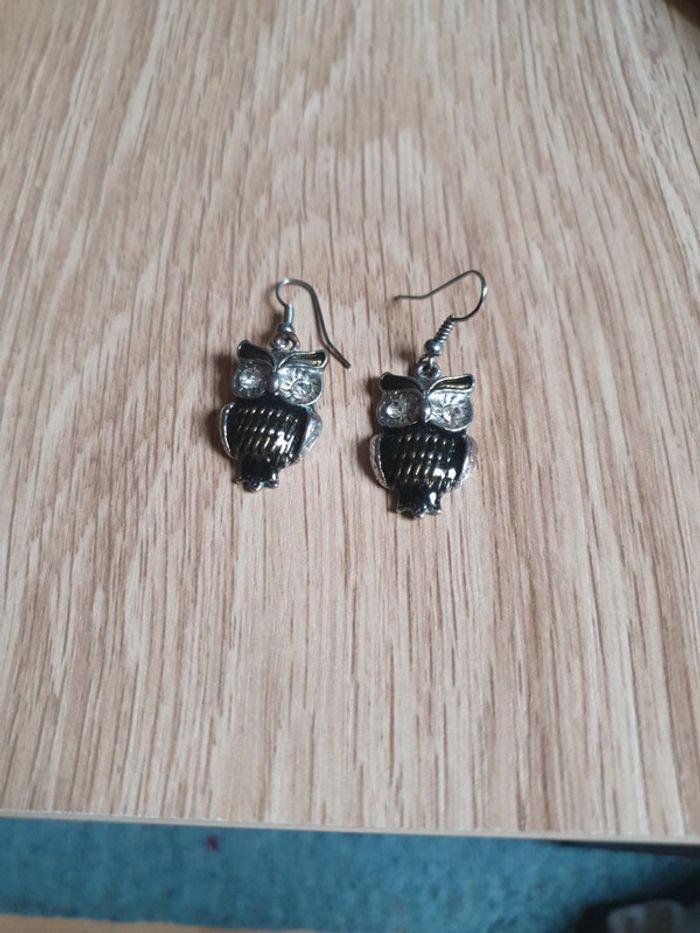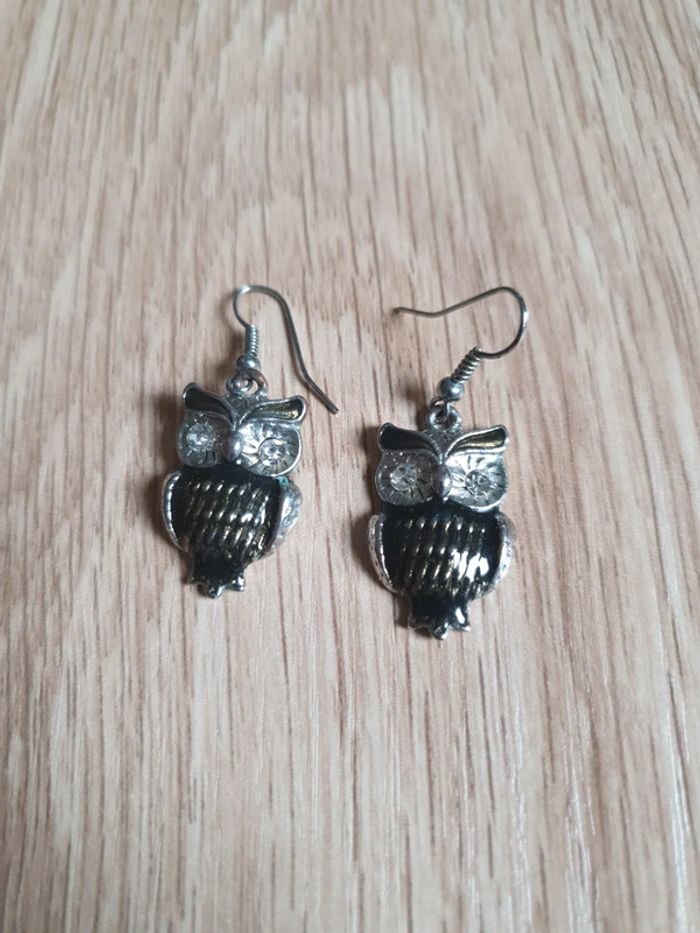 Boucles d'oreilles pendantes avec hiboux. Neuves jamais portées.