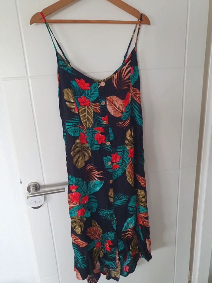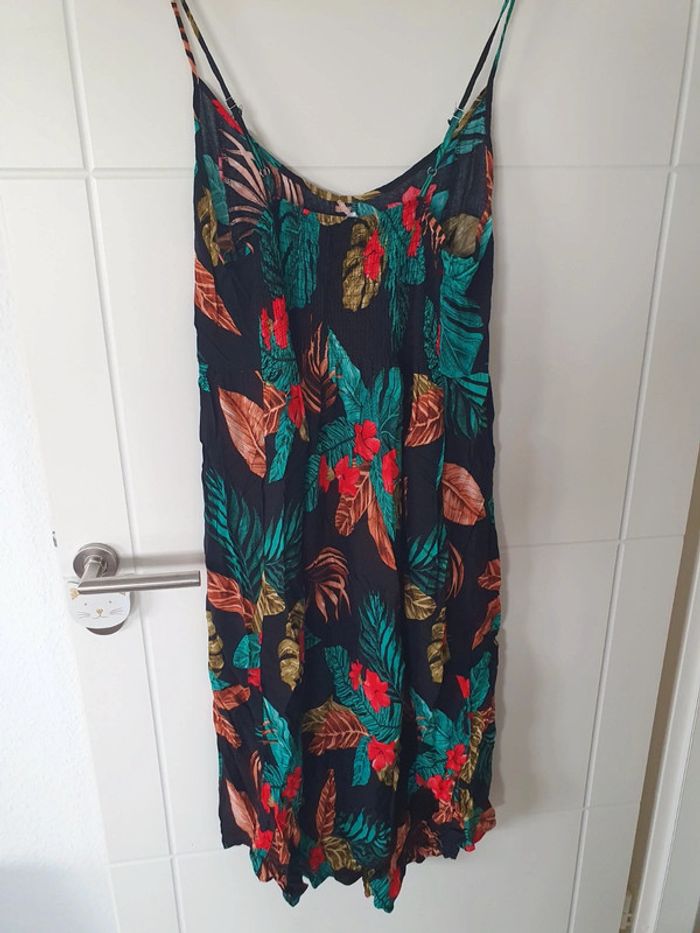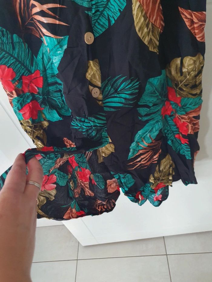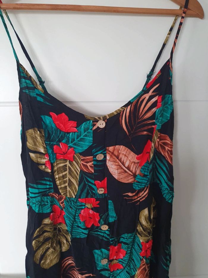 Robe mi-longue de couleur noire avec motif tropical. Très légère pour l'été et agréable à porter. Bretelles réglables. Smokée au niveau du dos. Parfait état, elle a été portée 2 fois. Taille unique (d'un 38/40 jusqu'au 44/46). - Largeur d'aisselle à aisselle : 43 cm et extensible jusqu'à 53 cm sans problème) - Longueur totale : 107 cm - Largeur des hanches : environ 65 cm.