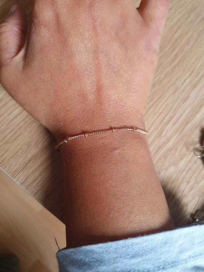 Bracelet doré en laiton avec petites perles dorées. Neuf, jamais porté. - Longueur totale : 18.5 cm.