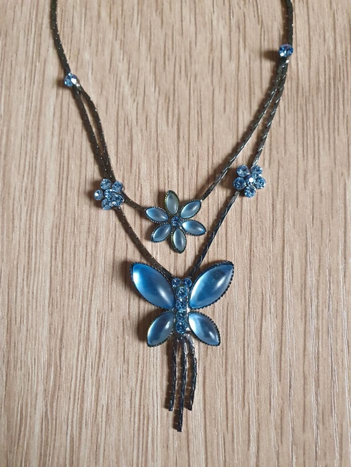 Collier bleu papillon et fleurs - photo numéro 1