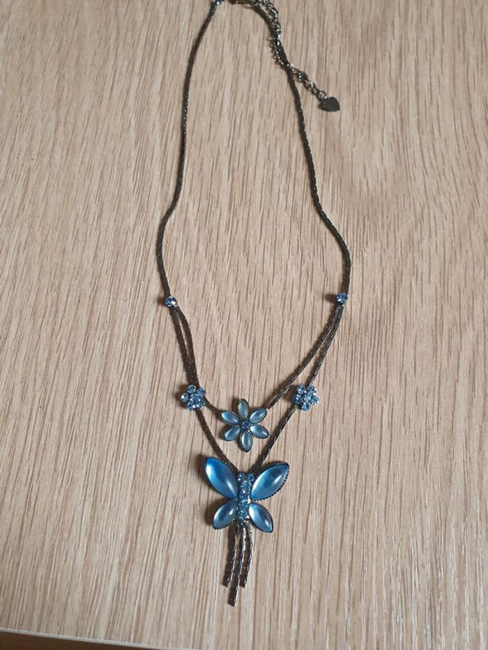 Collier bleu avec un papillon 🦋 et des fleurs. Jamais porté, il est neuf. - Longueur : 48 cm (40 cm + 8 cm de chainette)