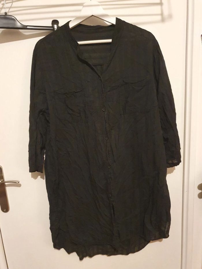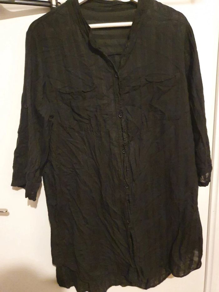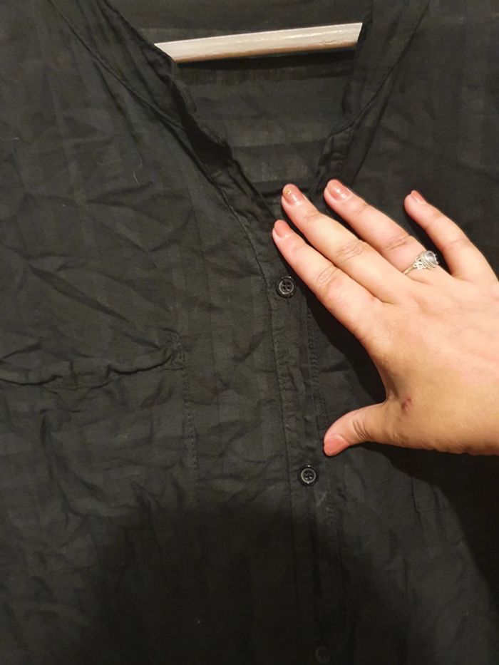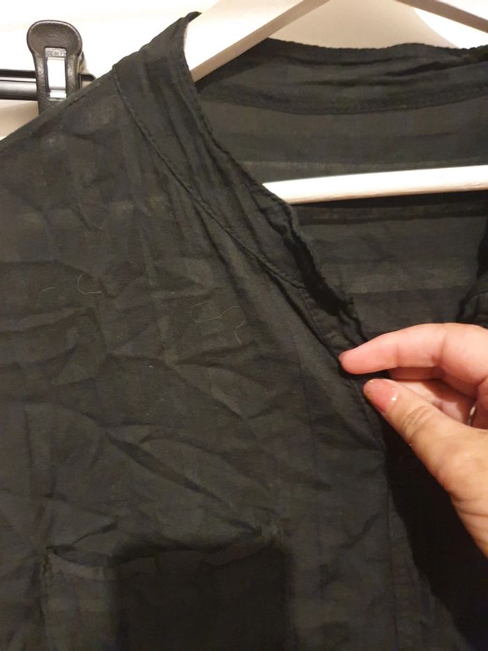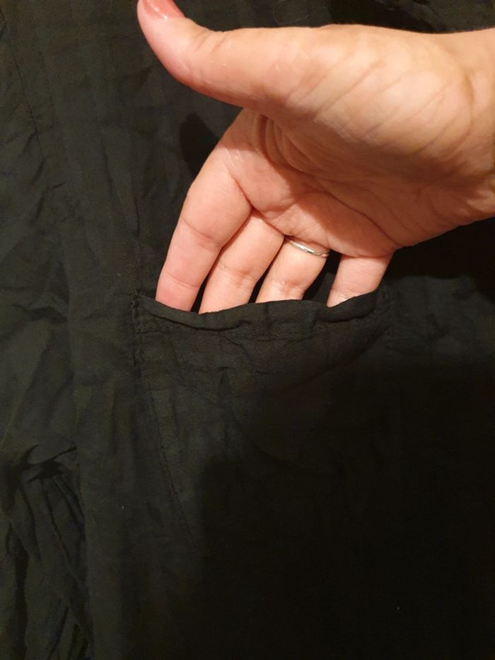Longue tunique noire ou robe courte. Se ferme par boutons. Petite poche sur la poitrine. Les manches peuvent se retrousser. Larges rayures verticales noires tons sur tons. Portée une seule fois. Parfait état. Taille unique, sans problème jusqu'à un 44.