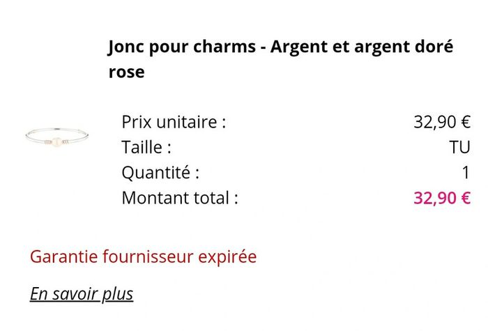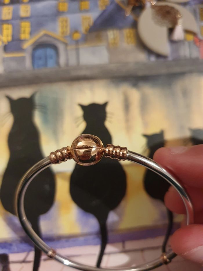Bracelet en argent et argent doré rose pour charms. Très bon état, légères imperfections au niveau du fermoir. Mis 2-3 fois, le reste du bracelet est nickel. Petite taille de poignet. Diamètre 5.5 cm.