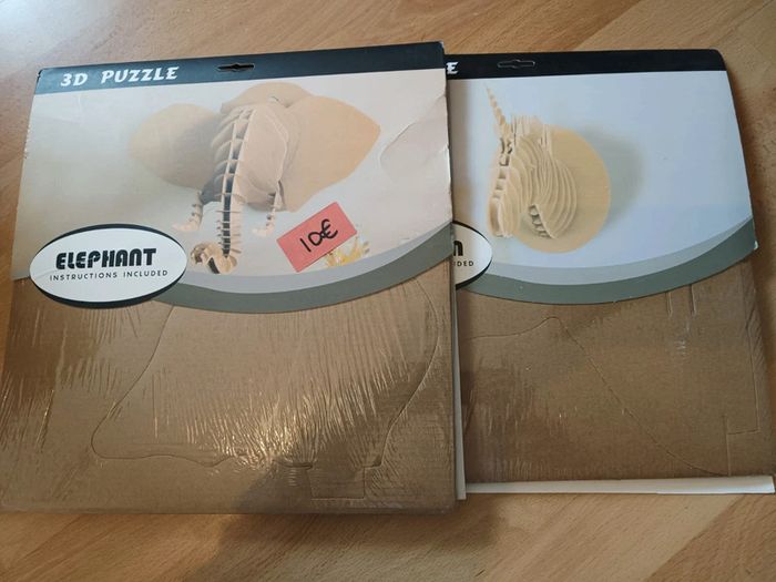 Puzzles 3D neufs sous blister neuf. Couleur bois. Modelle licorne et éléphant.