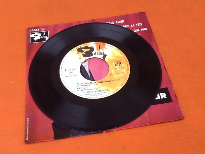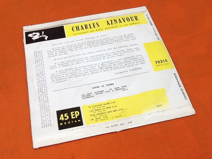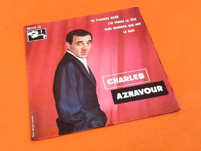 (article vendu en l' état, état d 'usage micro-rayures qui n'empêchent pas l' écoute du vinyle) Vinyle 45 tours Charles Aznavour Tu t' laisses aller (1961) Barclay 70315 A1 Tu T'Laisses Aller 3:38 A2 J'ai Perdu La Tête 2:46 B1 Plus Heureux Que Moi 2:25 B2 La Nuit 3:00