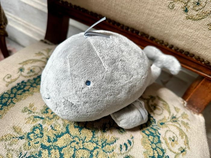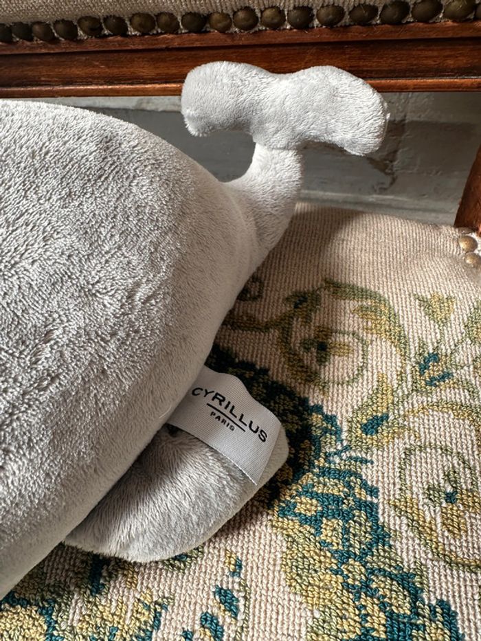 NEUF Cyrillus doudou peluche baleine couchée carreaux 25cm dans son sac grise naissance - photo numéro 6