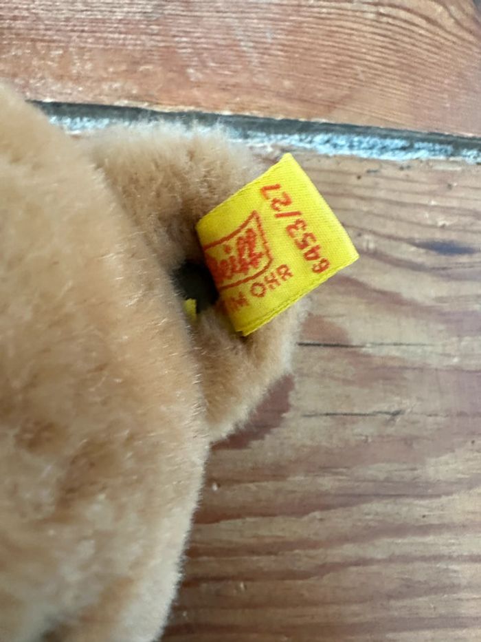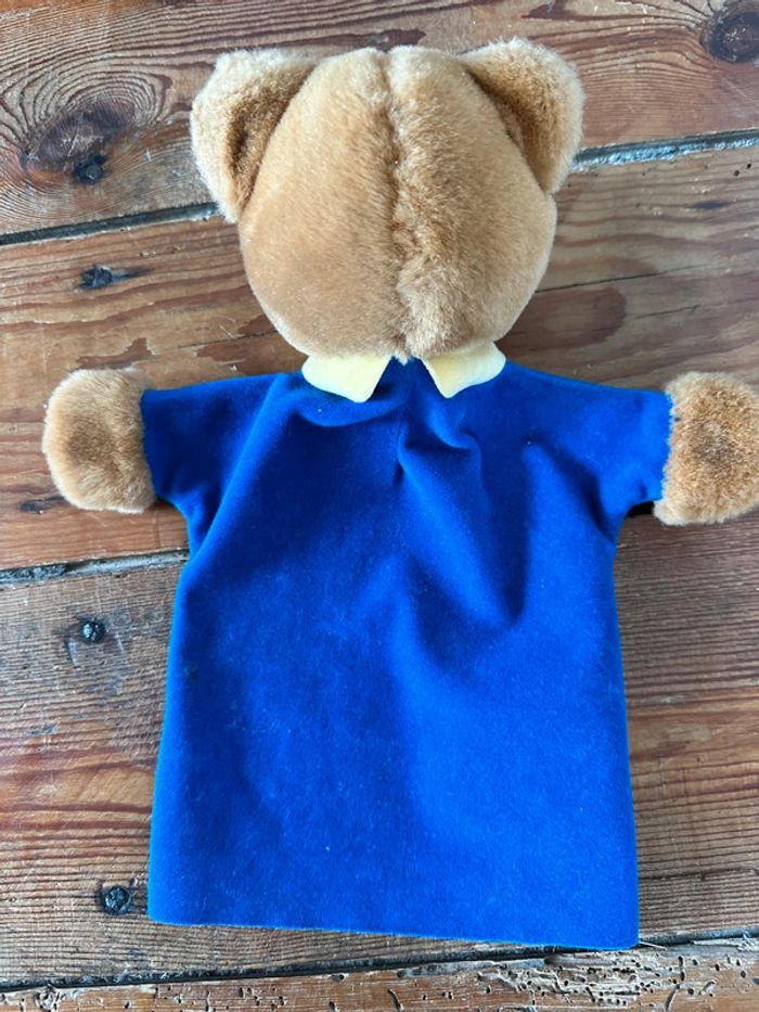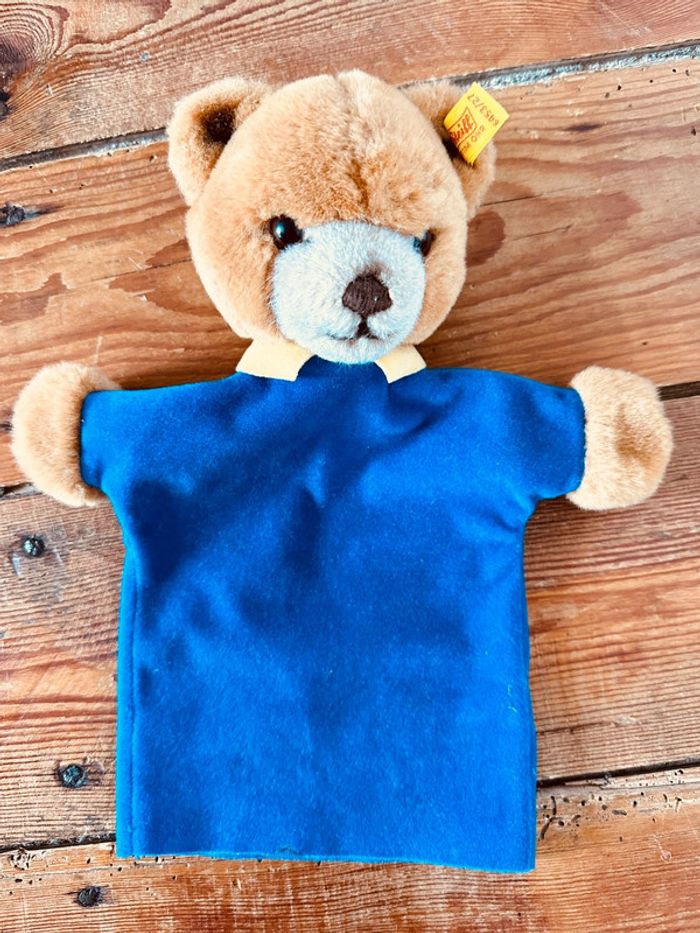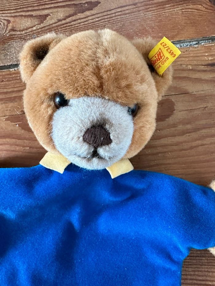 Peluche doudou marionnette vintage ancienne Ours Steiff bleu collerette ourson