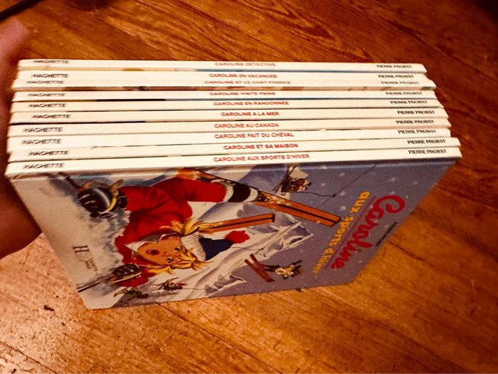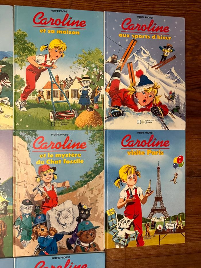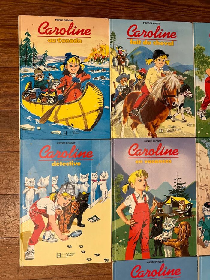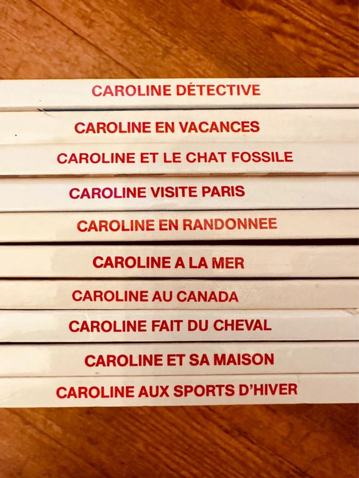 Envoi rapide et soigné Lot indissociable Liste des titres : Caroline au Canada Fait du cheval Et sa maison Aux sports d’hiver Détective En vacances Et le mystère du chat fossile Visite Paris En randonnée A la mer