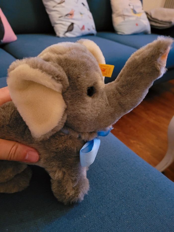 RARE Peluche Éléphant Steiff 28cm gris ancien noeud papillon étiquette jaune collection doudou - photo numéro 1