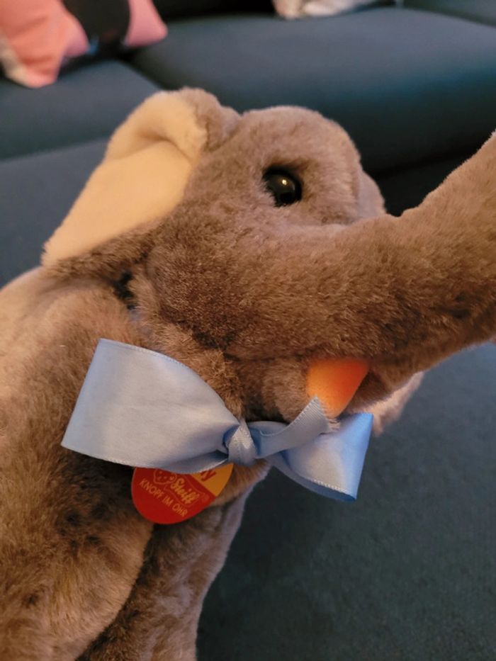 RARE Peluche Éléphant Steiff 28cm gris ancien noeud papillon étiquette jaune collection doudou - photo numéro 7