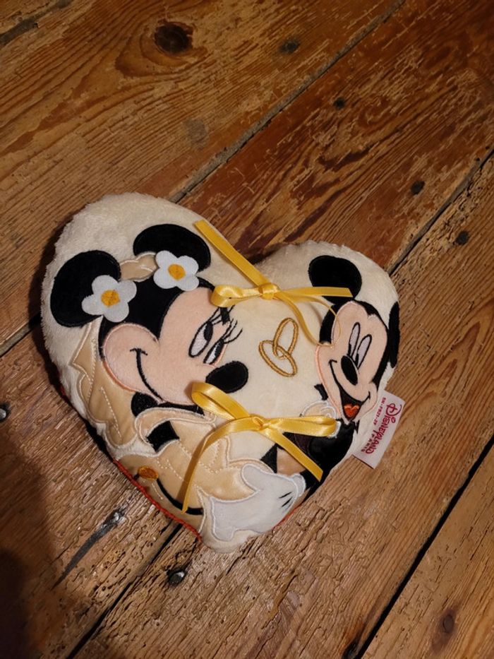 Disney Coussin cœur porte alliances Mickey Minnie Mariage Disneyland noeud peluche collection or - photo numéro 1