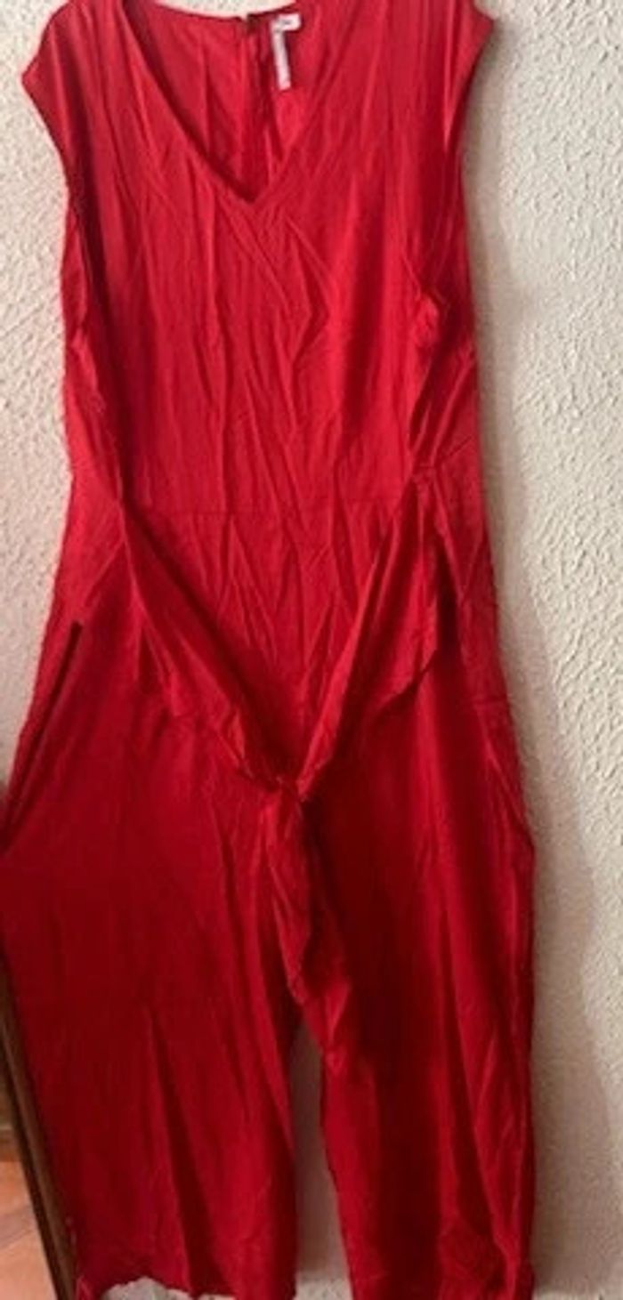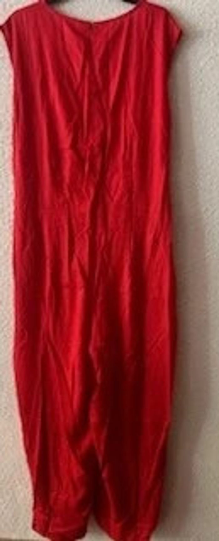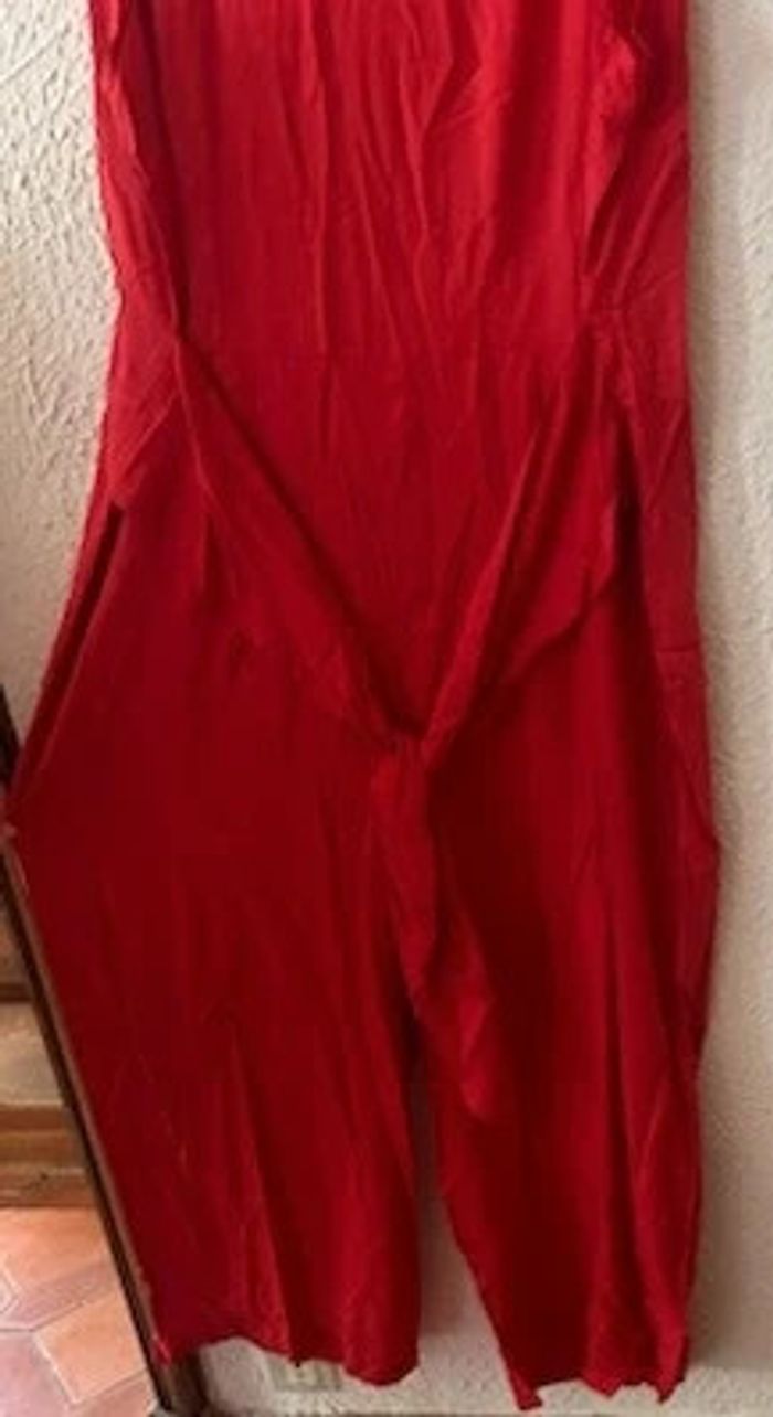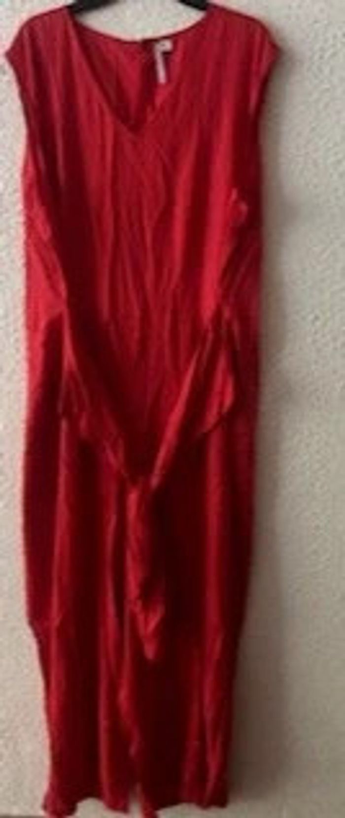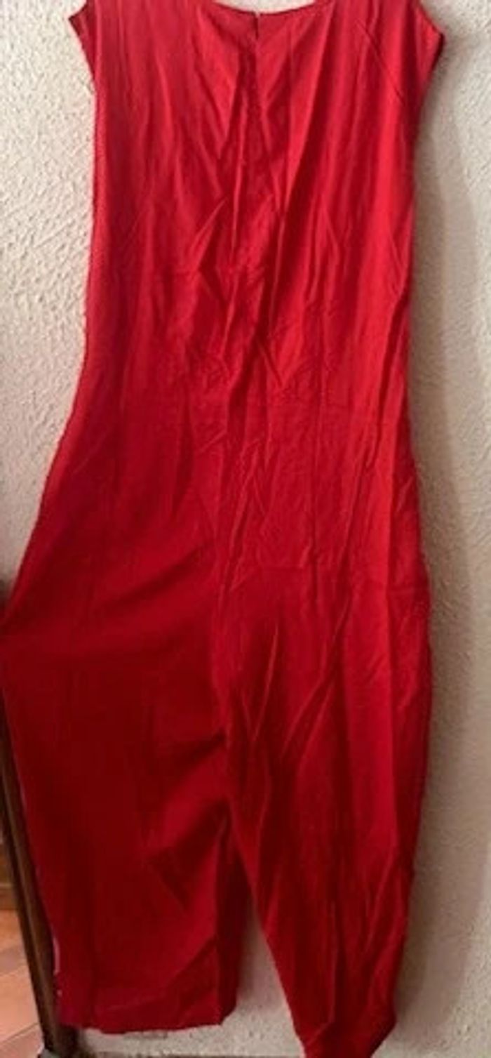 Combinaison pantalon col V sans manches - Encolure V - Pinces taille devant et dos - Fermé milieu dos par glissière invisible. - Large bande à la taille à nouer prise dans la couture de côté. - Pantalon large - 2 plis devant et 2 pinces au dos. - Finition par ourlet - Entrejambe 67 cm env. - Longueur pantalon 7/8ème Composition : -Tissu 100% viscose Taille : 54 Coloris : rouge Prix : 33€ Neuve jamais portée #sisterkayafemmet54 Réf : g.ii+1