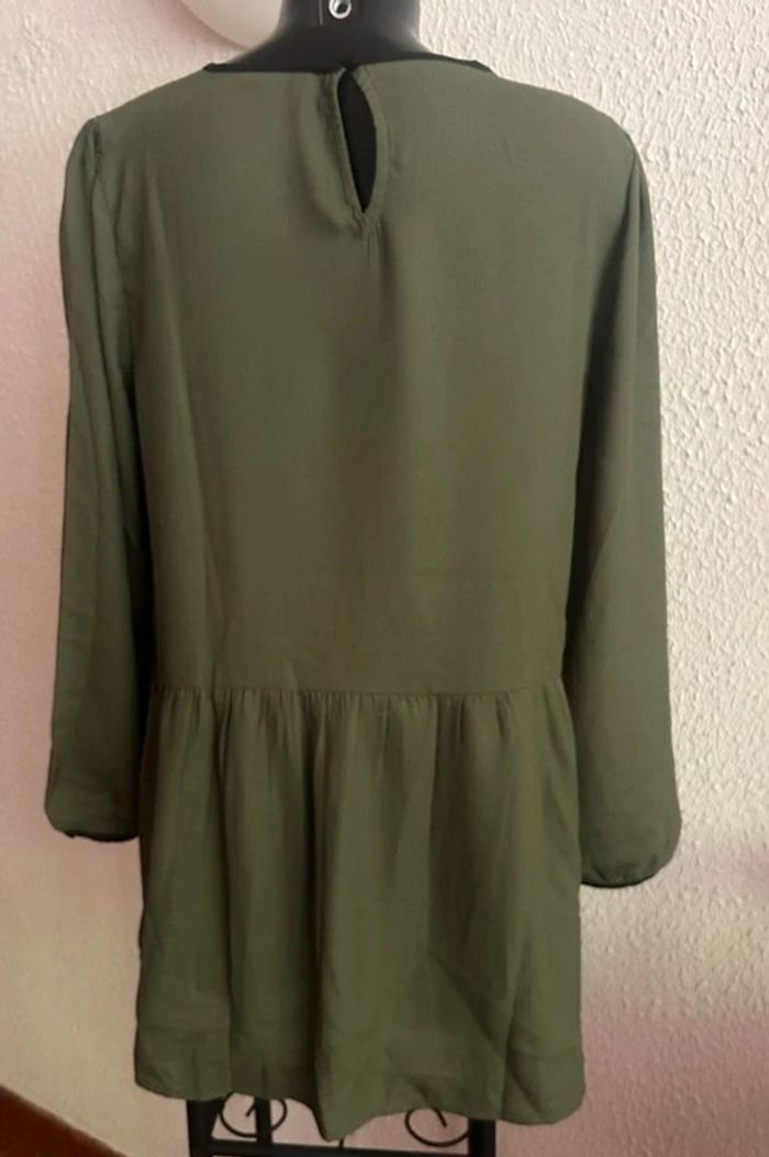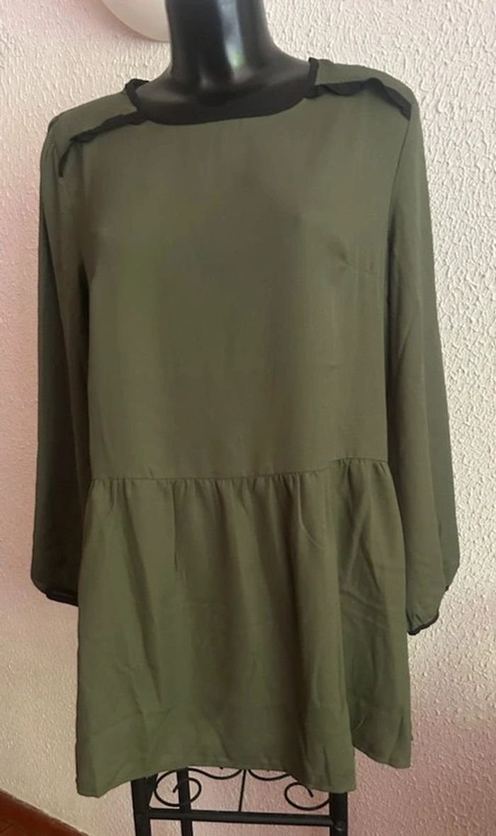 Longue tunique unie bicolore - Crêpe fluide - Col rond devant avec biais contrasté - Goutte boutonnée dans le dos - Empiècement volanté contrasté sur les épaules devant - Manches longues avec fronces en tête de manche et aux poignets, finis par un biais contrasté - Découpe volantée froncée à la taille - Base droite - Longueur 80 cm environ Composition : - Crêpe 100% polyester Taille : 46 Coloris : kaki Prix : 13€ Neuve jamais portée #sisterkayafemmet46 Réf : b.gi +1