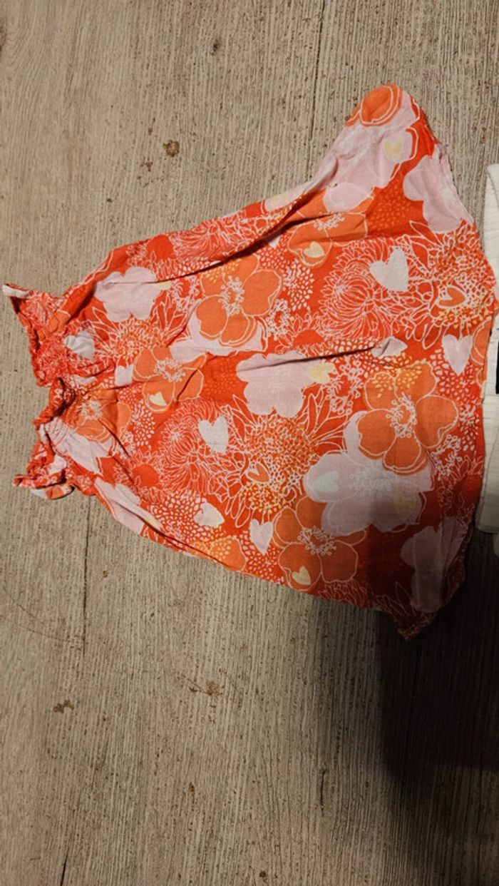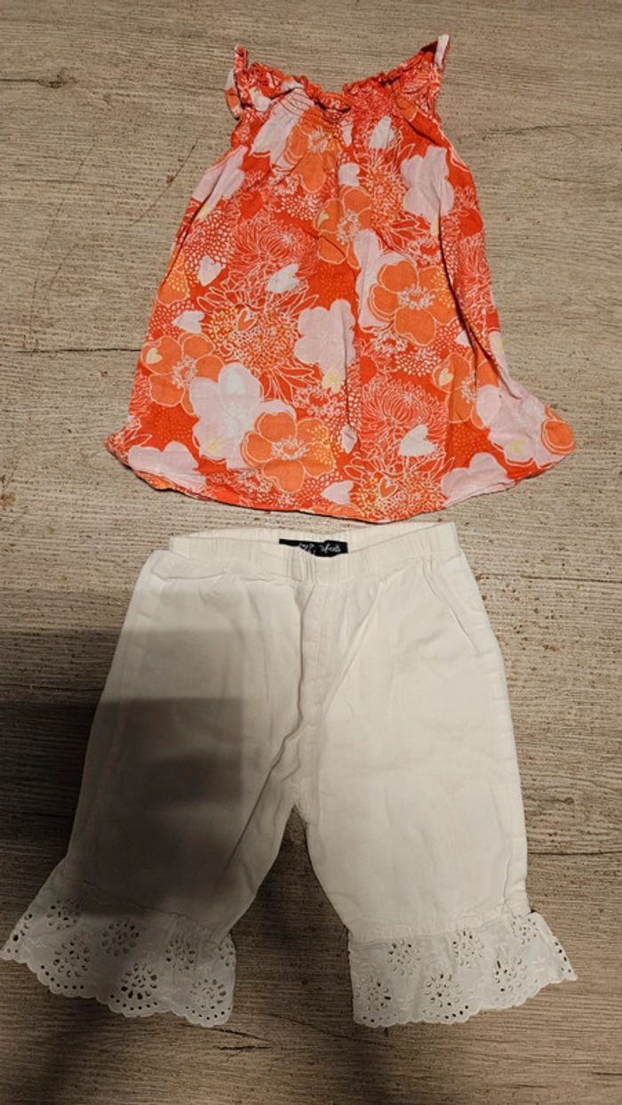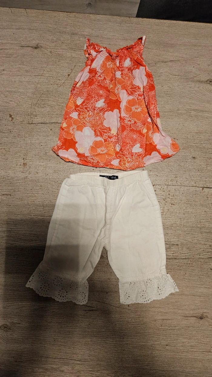 Ensemble 1 pantalon blanc avec le bas en broderie Lili Gaufrettr, élastique à la taille 1 blouse à bretelles rose clair et foncé peu mise #deborahtock_12mois