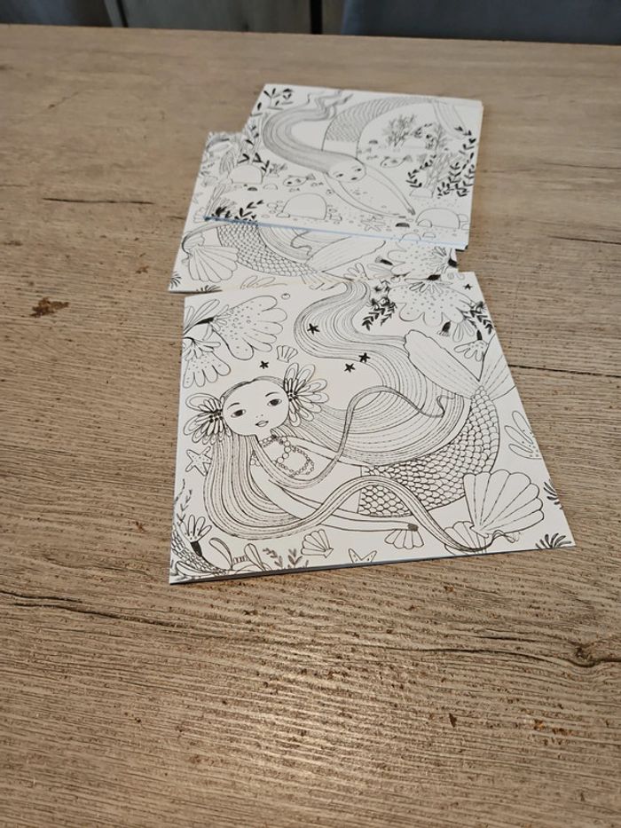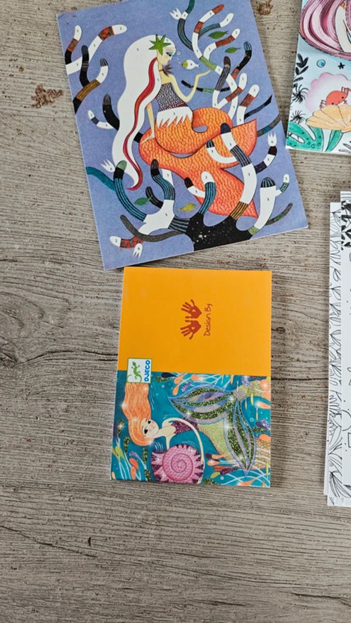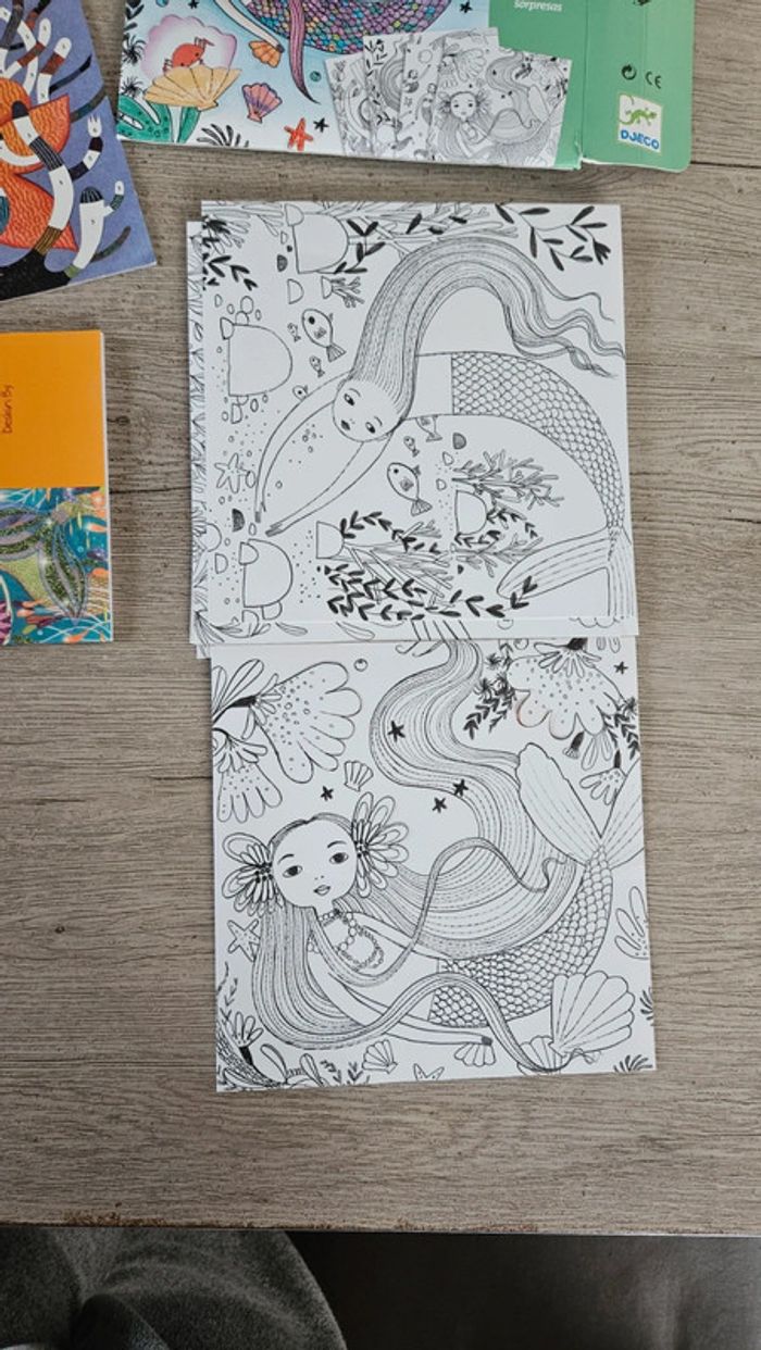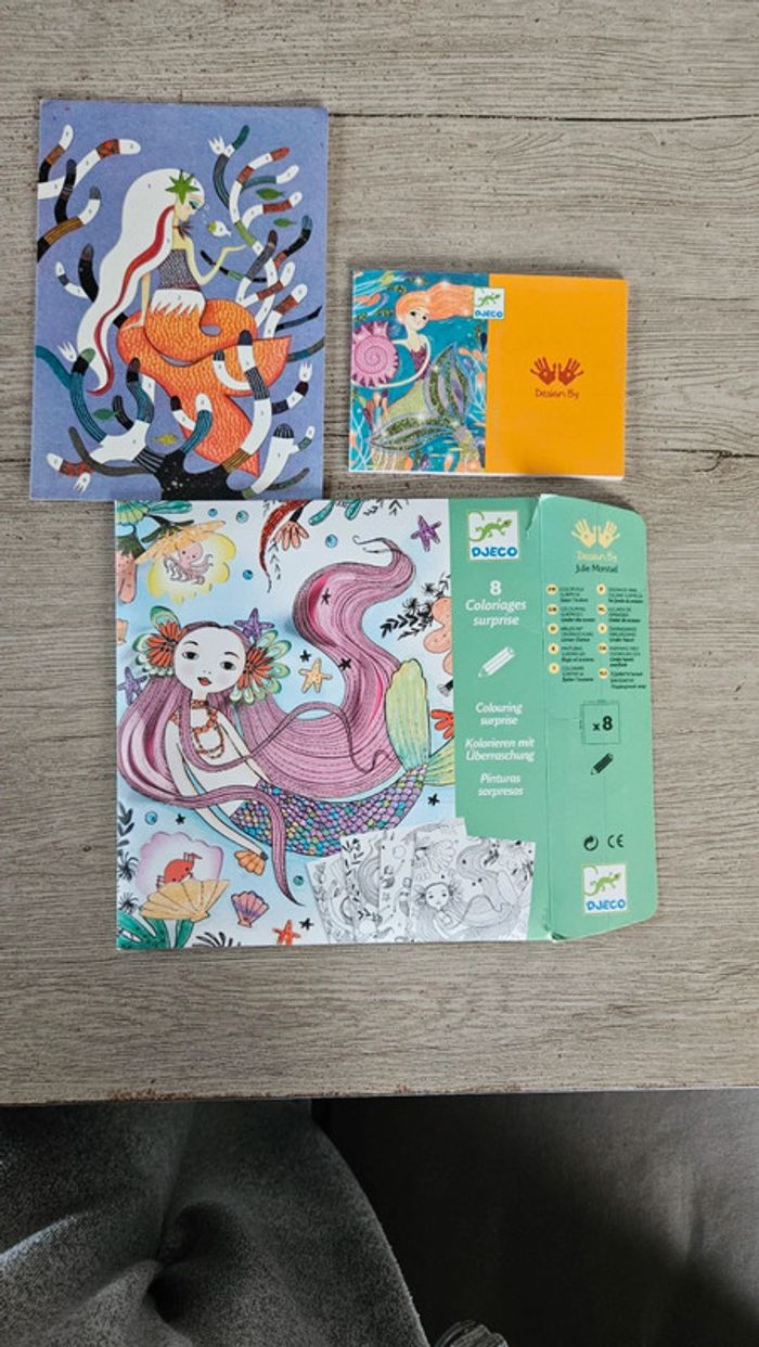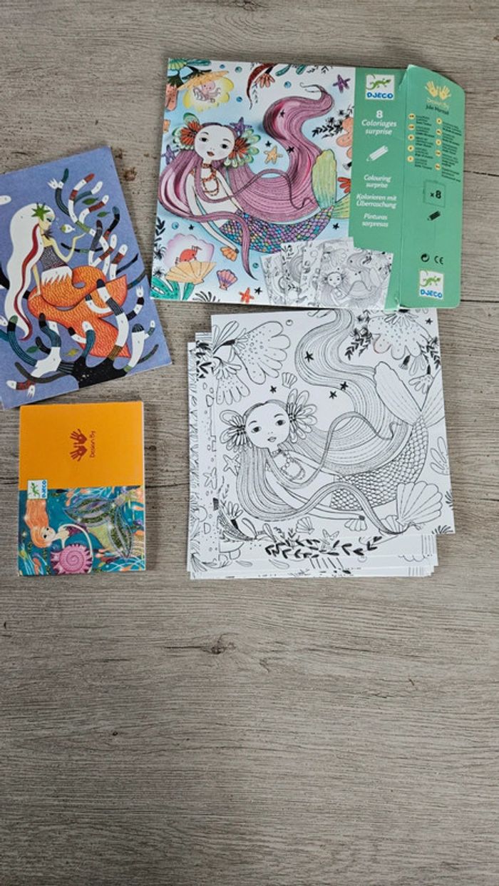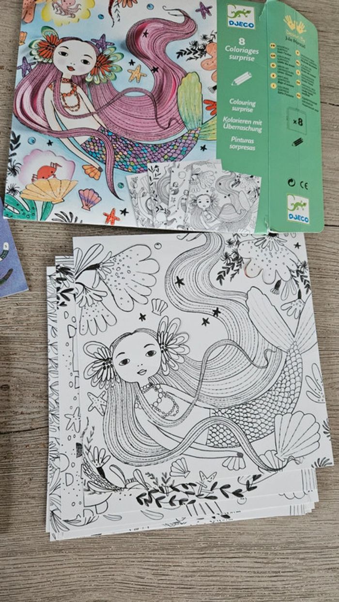 Boite neuve, ouverte pour les photos de l annonce. Composée de 8 coloriages sous forme de carte avec 1 partie du dessin à détacher. Pour enfant de 6 à 9 ans. Thème sous l océan donc avec sirènes #deborahtock_jeu