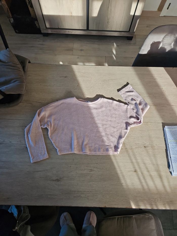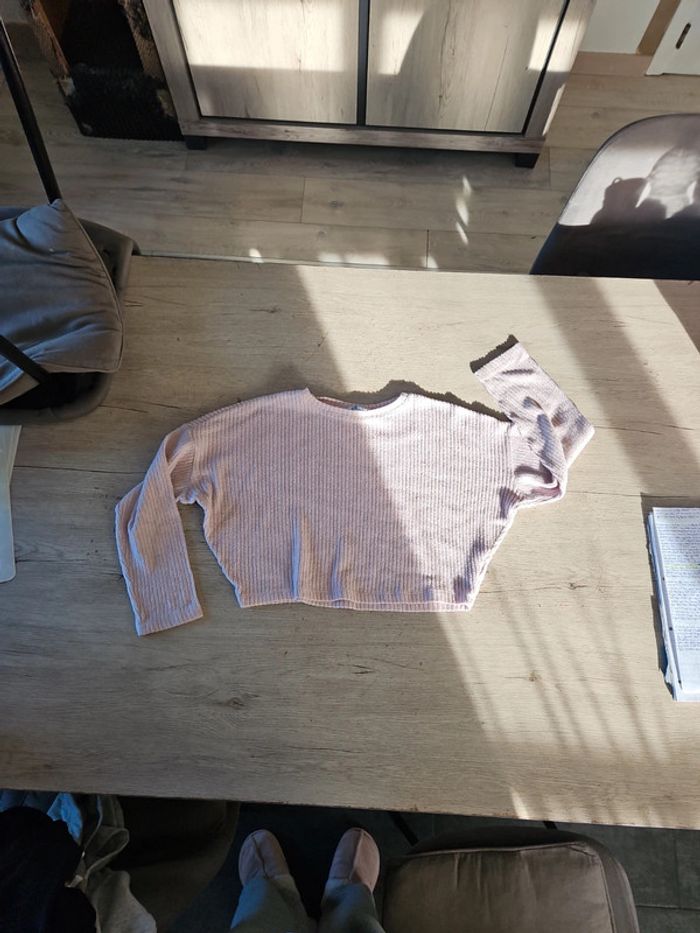 Croc pull d ado de couleur rose clair. Mis mais encore bien. Manches longues. Col rond à raz de cou. Convient bien pour du 10 à 12 ans #deborahtock_10ans #deborahtock_12ans