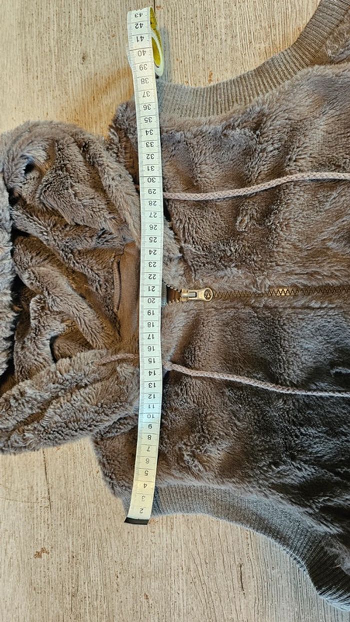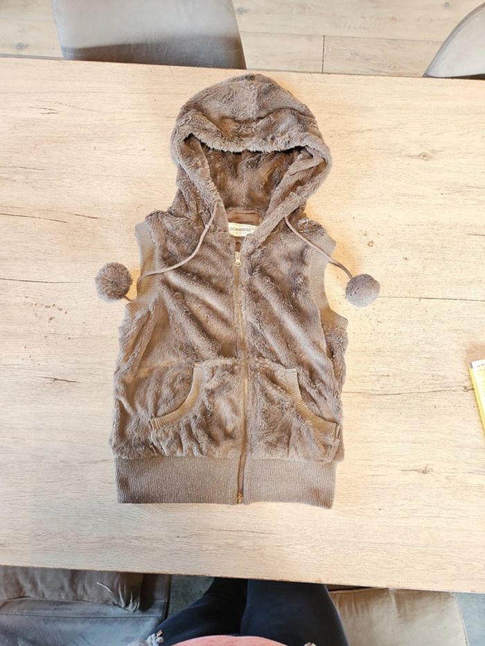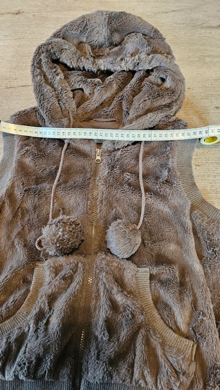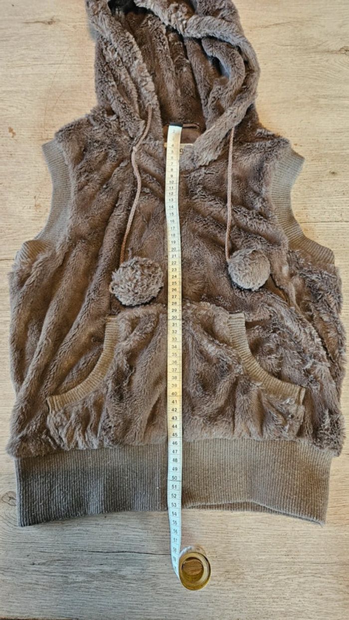 Joli gilet sans manche tout doux. Taille L, correspond à du 14 à 16 ans. D épaule à epaule 37 cm, hauteur 53 cm. Avec poches. Mis 1 seule fois car ma fille n aime pas. Avec cordon au capuchon avec pompom. #deborahtock_14ans #deborahtock_16ans