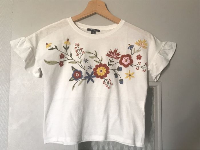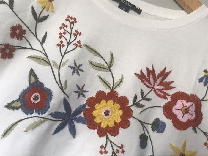 toutes les fleurs sont brodées . manches à volants. arrive au niveau de la ceinture