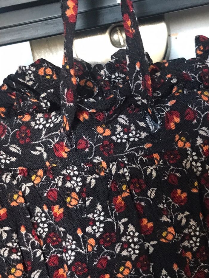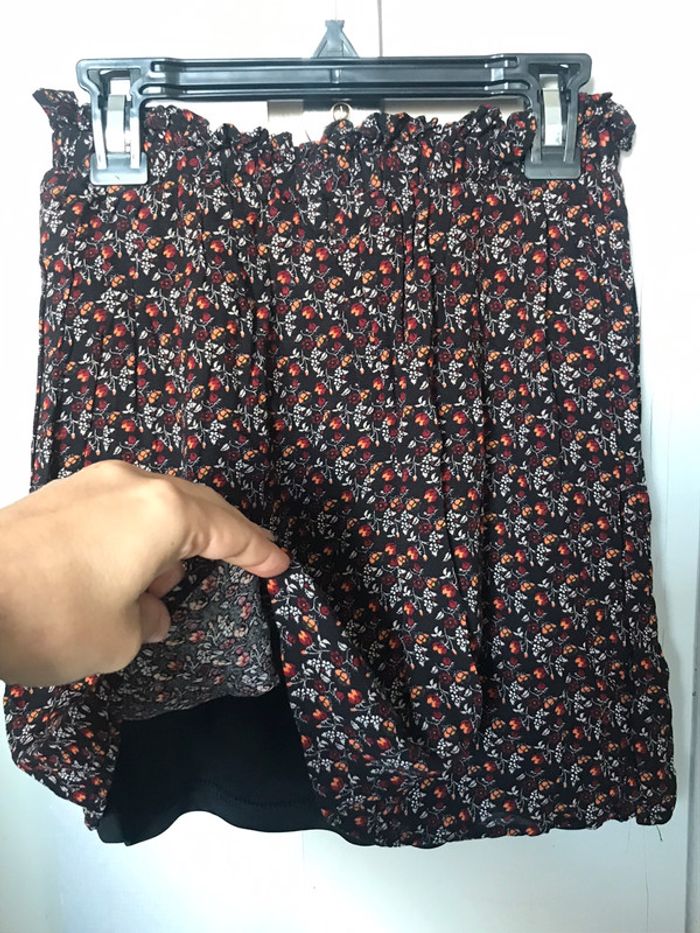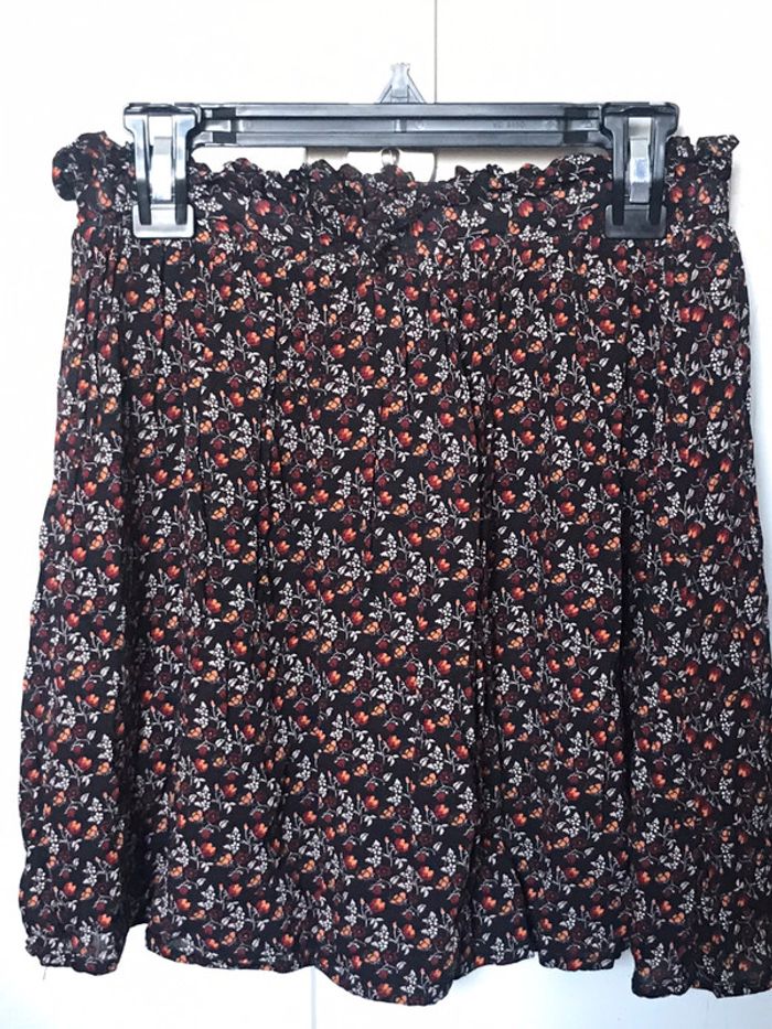 très jolie jupe comme neuve, portée 2fois. taille élastique . couleurs noir, orange, bordereau et blanc