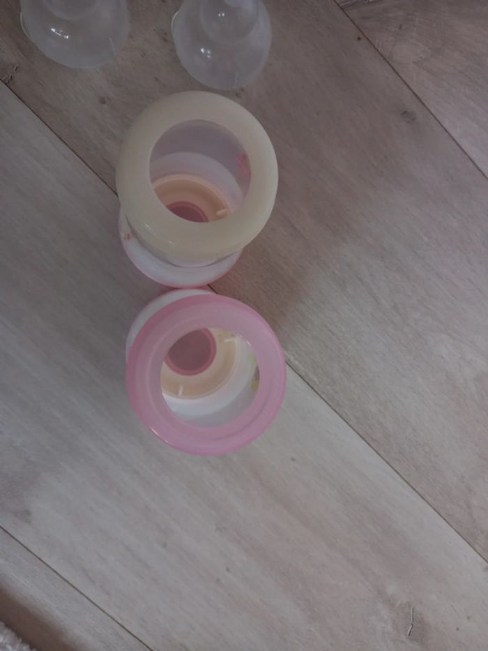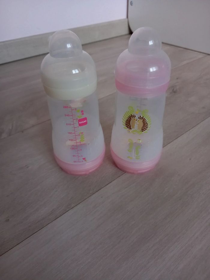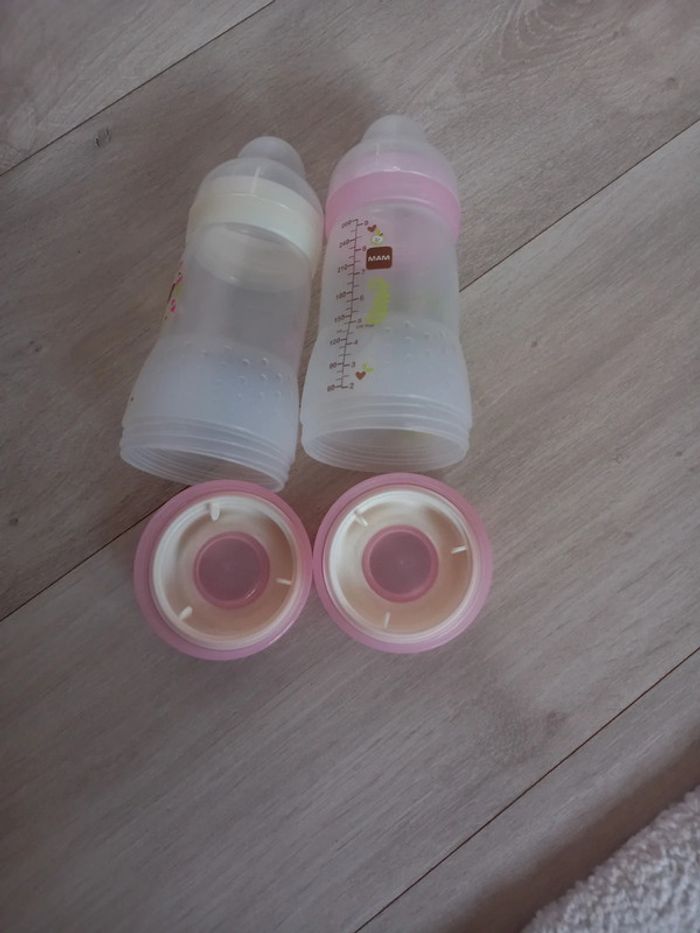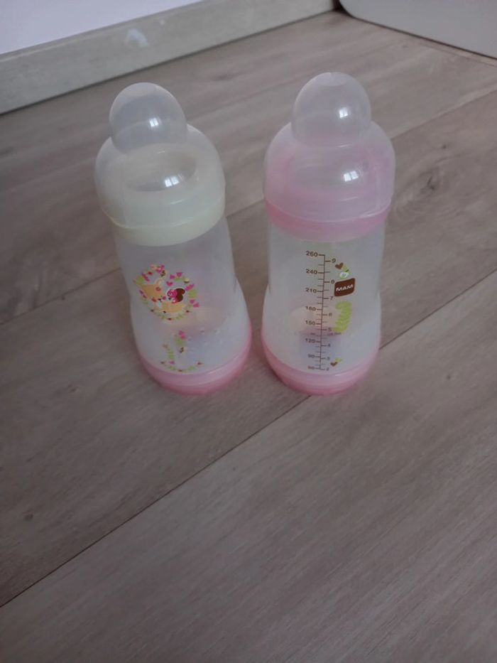 2 Biberons anti colique en bon état. 260 ML. En plastique. Les tétines sont absentes. Faciles à nettoyer car se dévissent par le bas.