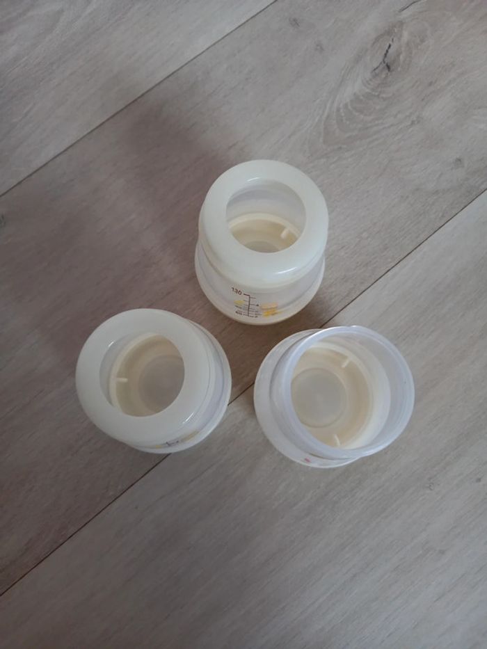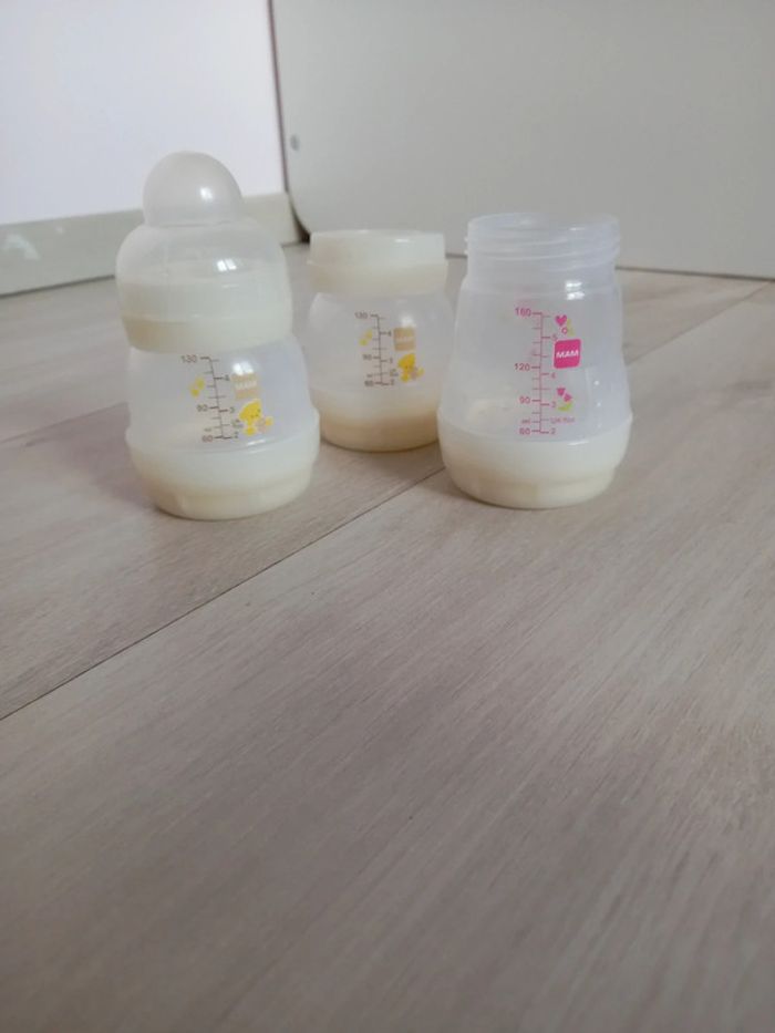 Lot de 3 biberons anti colique de chez MAM. En plastique. 2 de 130 ML et 1 de 160 ML. Pas de tétines. Attention ip n'y a qu'un seul capuchon et il manque un goulot à visser.