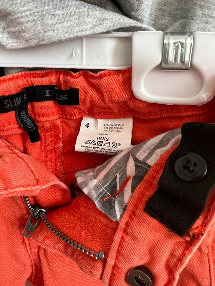 Tenue 2 pièces composée : - d’un teeshirt ML gris avec soldat de marque IKKS. Rappel du orange du pantalon avec le casque. Il est en 100% coton et est en excellent état. - pantalon matière jeans orange coupe plutôt ajustée/slim. Léger délavage au niveau des genoux + légère trace signalée et ceinture réglable à la taille. Il taille assez grand au niveau de la longueur donc parfait pour du 4/5 Ans. Marque IKKS. Tenue en très bon état 🧡 qui permet de changer du bleu et gris. 🛍️ N’hésitez pas à jeter un œil à mon et composer votre lot j’ai d’autres articles qui vous attendent en garçon 4/5 ans 🎉 #garçon4ans_lapetitemarie #garçon5ans_lapetitemarie