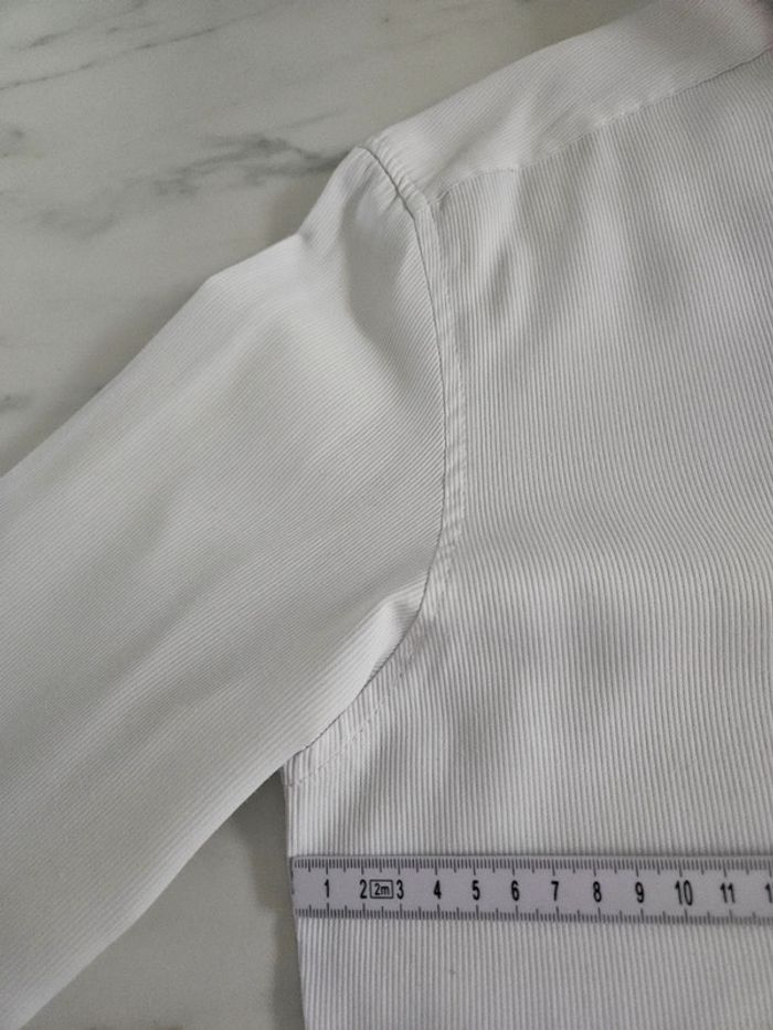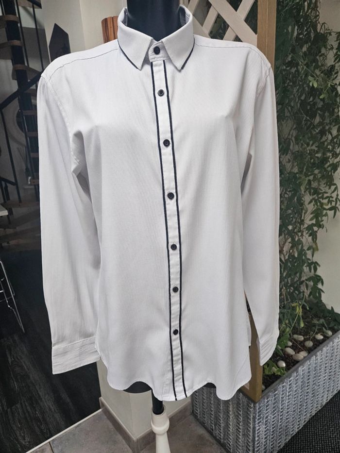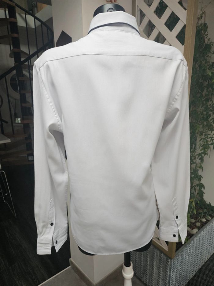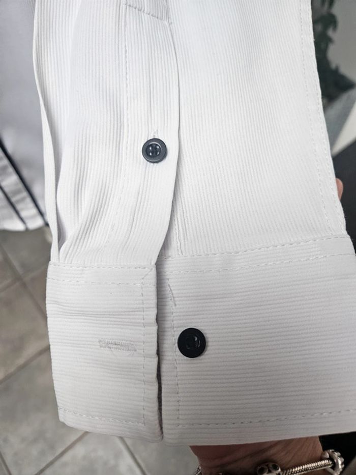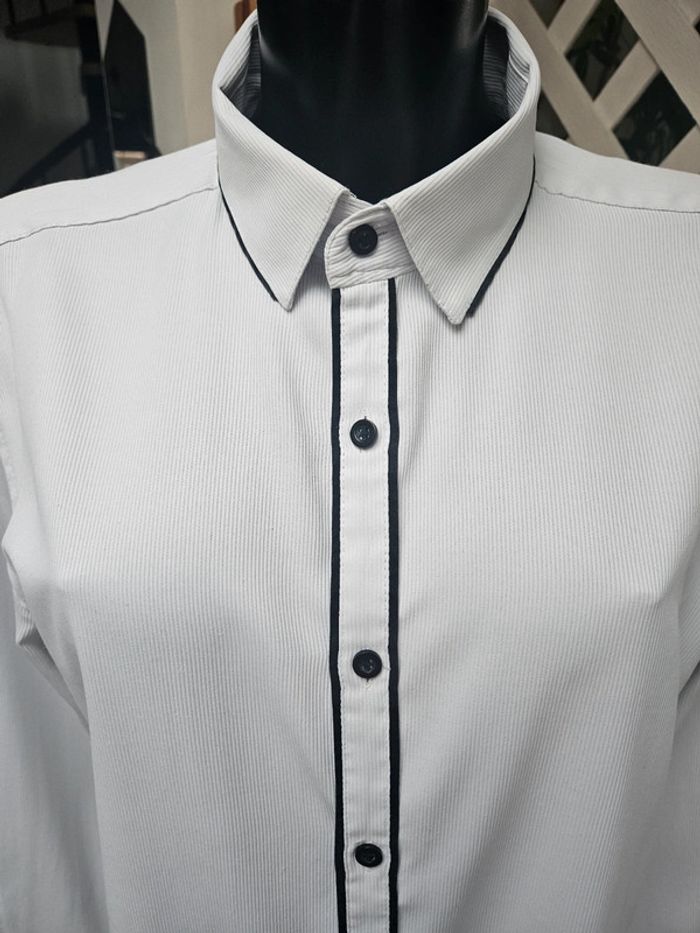 Chemise blanche slim fit détails noir. Matière super agréable avec effet ligné. Portée en bon état. Le Col est légèrement marqué visible sur photos ainsi que les dimensions
