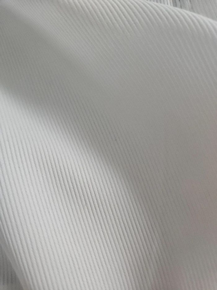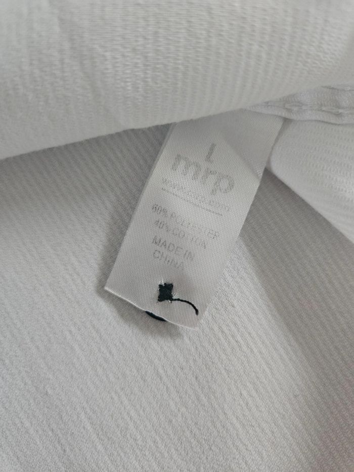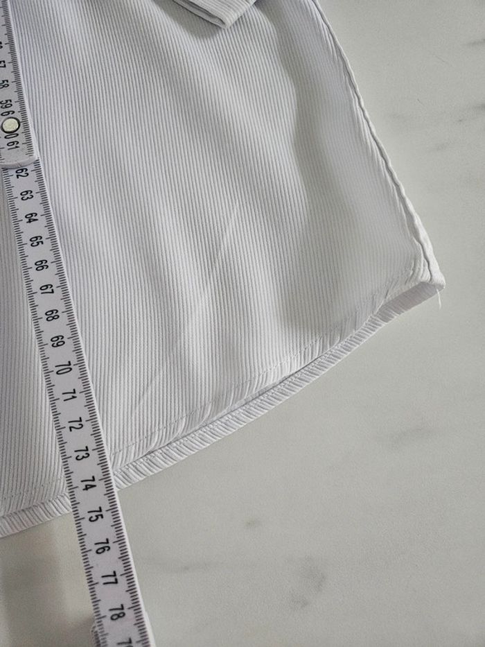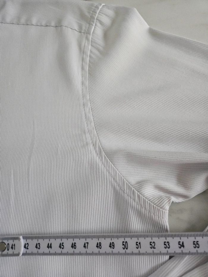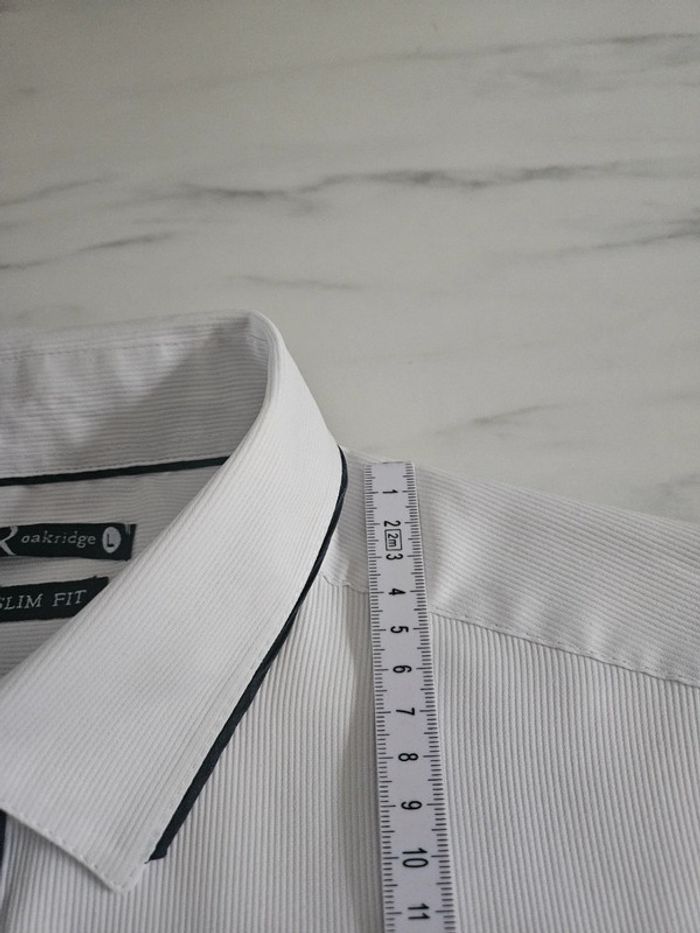 Chemise blanche slim fit détails noir. Matière super agréable avec effet ligné. Portée en bon état. Le Col est légèrement marqué visible sur photos ainsi que les dimensions