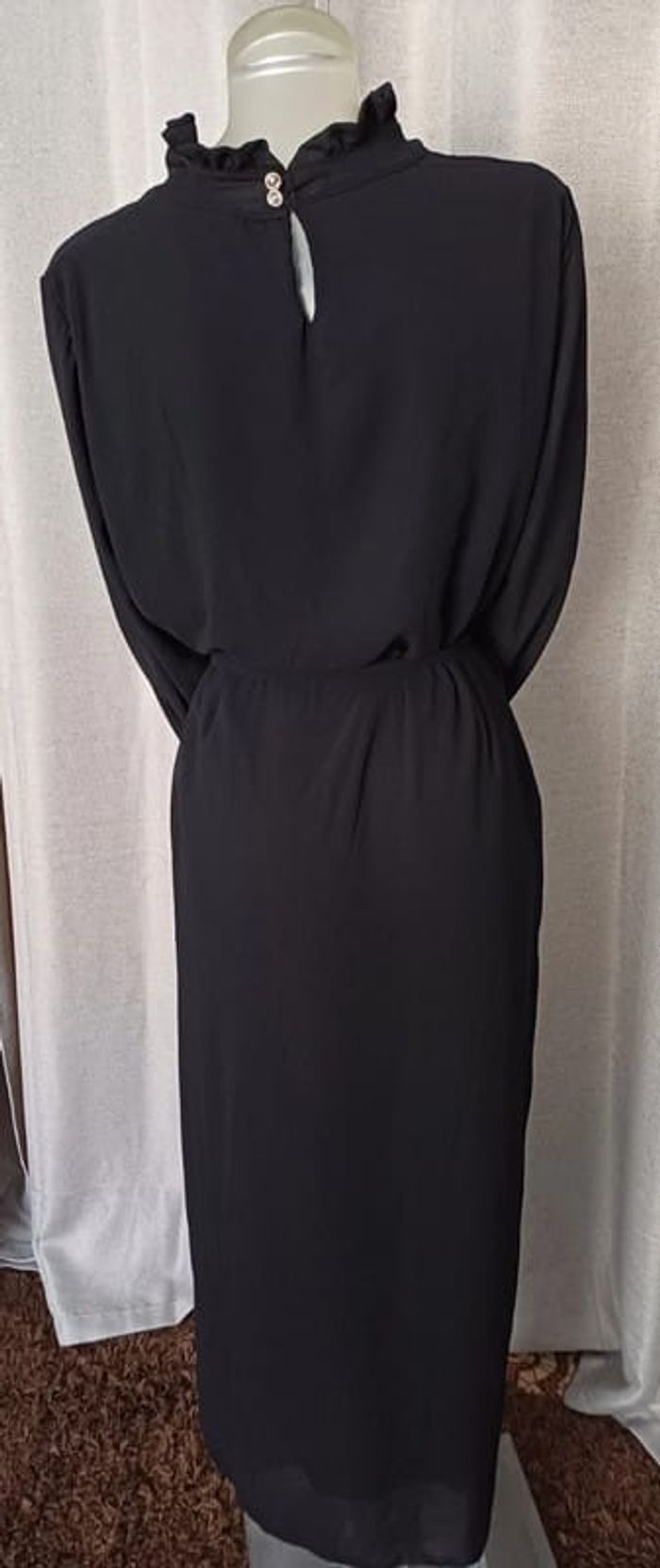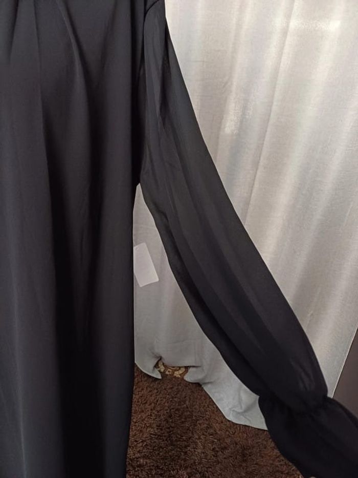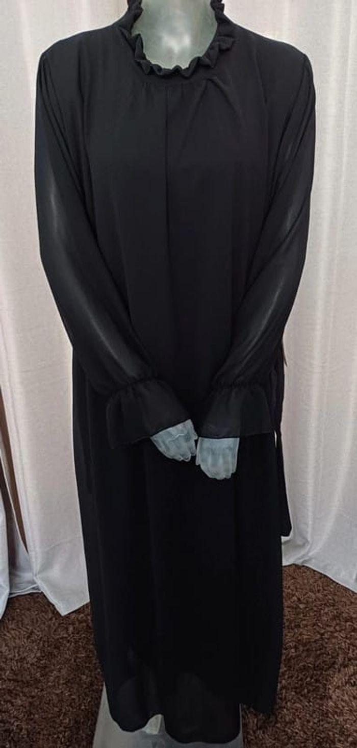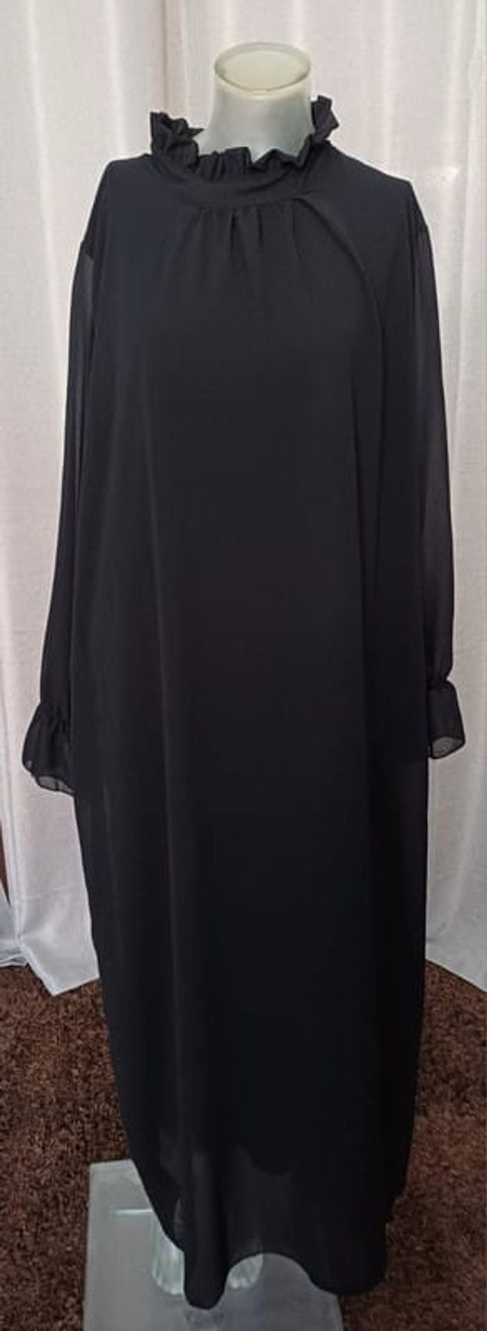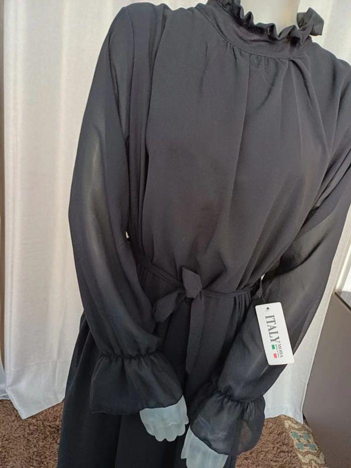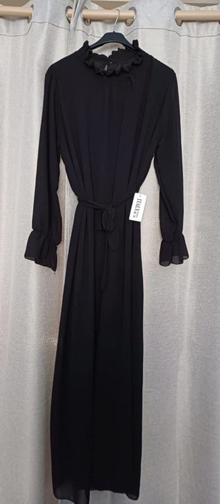 Robe en voilage lisse de grande qualité , doublé d'un tissu épais garantissant aucune transparence au niveau du corps. Mode et style de grande qualité Couleur noir Fabriqué en Italie Taille unique Cependant voici les mesures+/-: Épaule 46,5 cm Taille (hanche) 69 cm Longueur manche 62 cm Longueur robe 146 cm