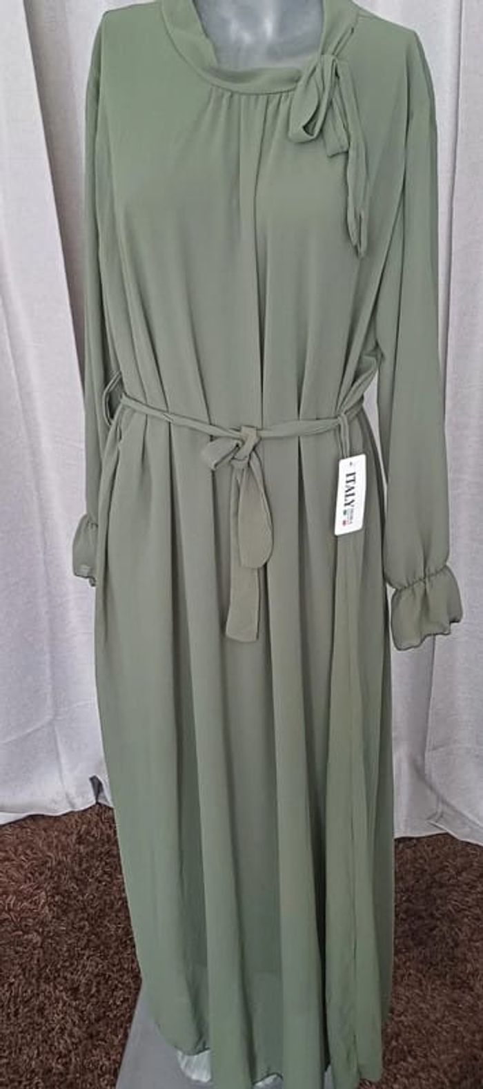 Robe en voilage lisse de grande qualité , doublé d'un tissu épais garantissant aucune transparence au niveau du corps. Mode et style de grande qualité Couleur kaki Fabriqué en Italie Taille unique Cependant voici les mesures+/-: Épaule 46,5 cm Taille (hanche) 69 cm Longueur manche 62 cm Longueur robe 146 cm